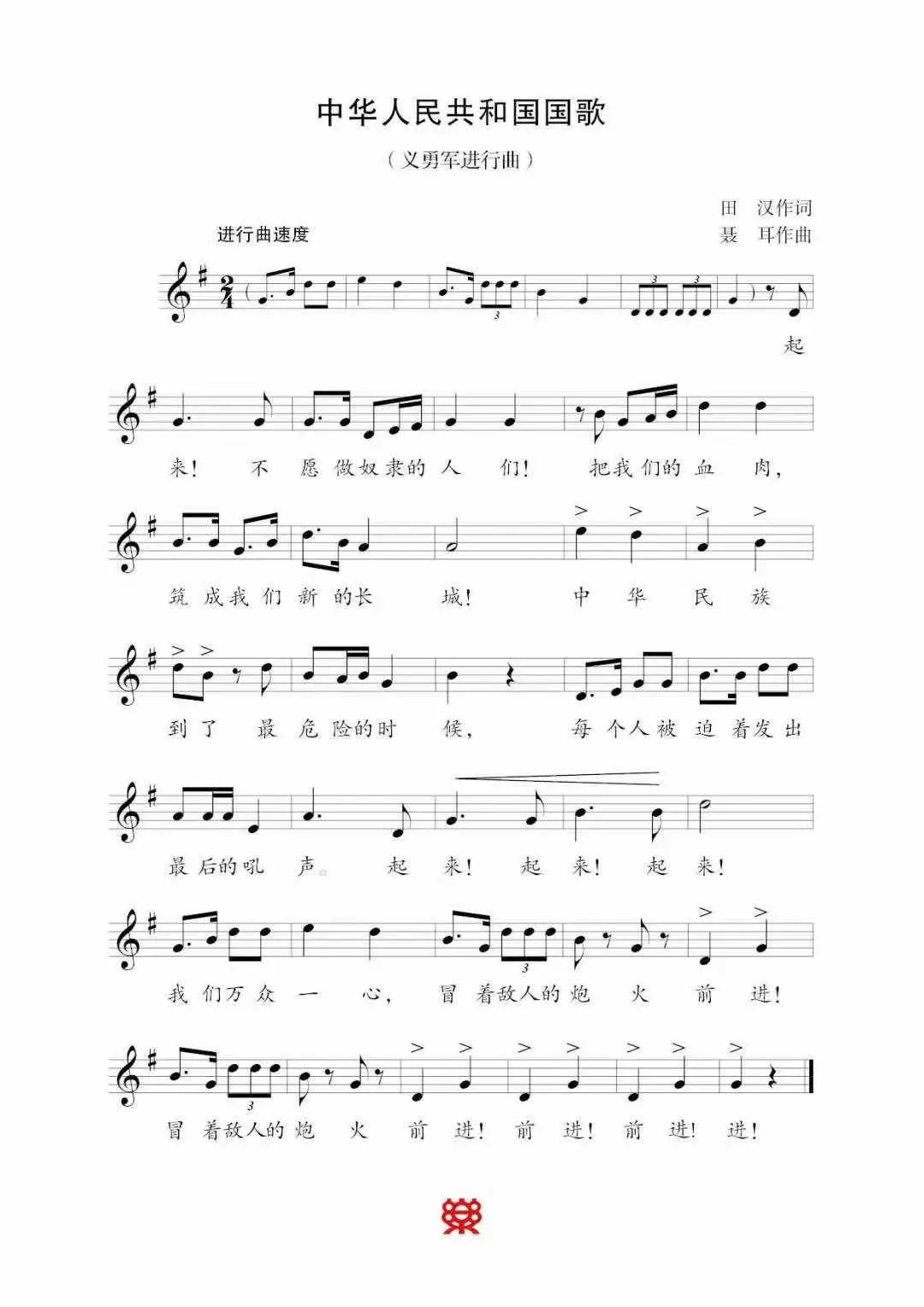 | 起来!不愿做奴隶的人们! 把我们的血肉筑成我们新的长城! 中华民族到了最危险的时候, 每个人被迫着发出最后的吼声。 起来!起来!起来! 我们万众一心, 冒着敌人的炮火,前进! 冒着敌人的炮火,前进! 前进!前进、进! |