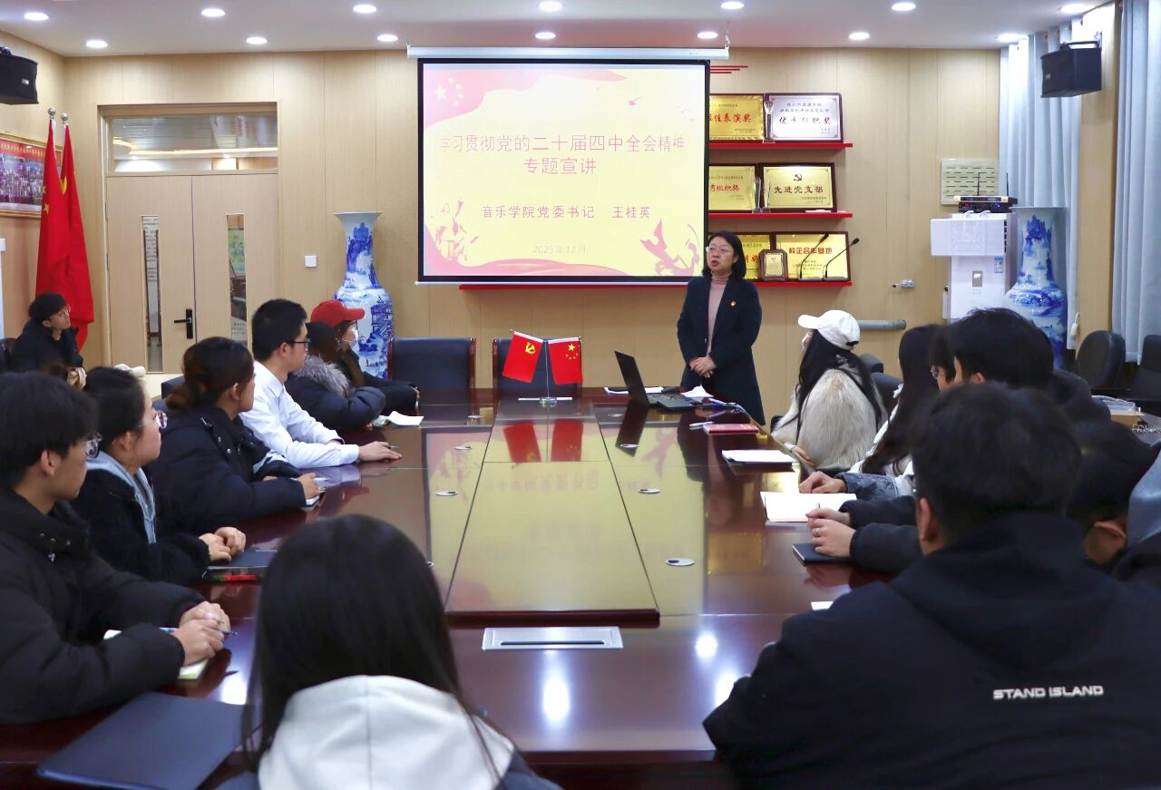 为深入学习贯彻党的二十届四中全会精神,引导青年党员坚定理想信念、勇担时代使命,12月9日,音乐学院举行党的二十届四中全会精神宣讲会。党委书记王桂英作专题宣讲,学生党员参加会议。