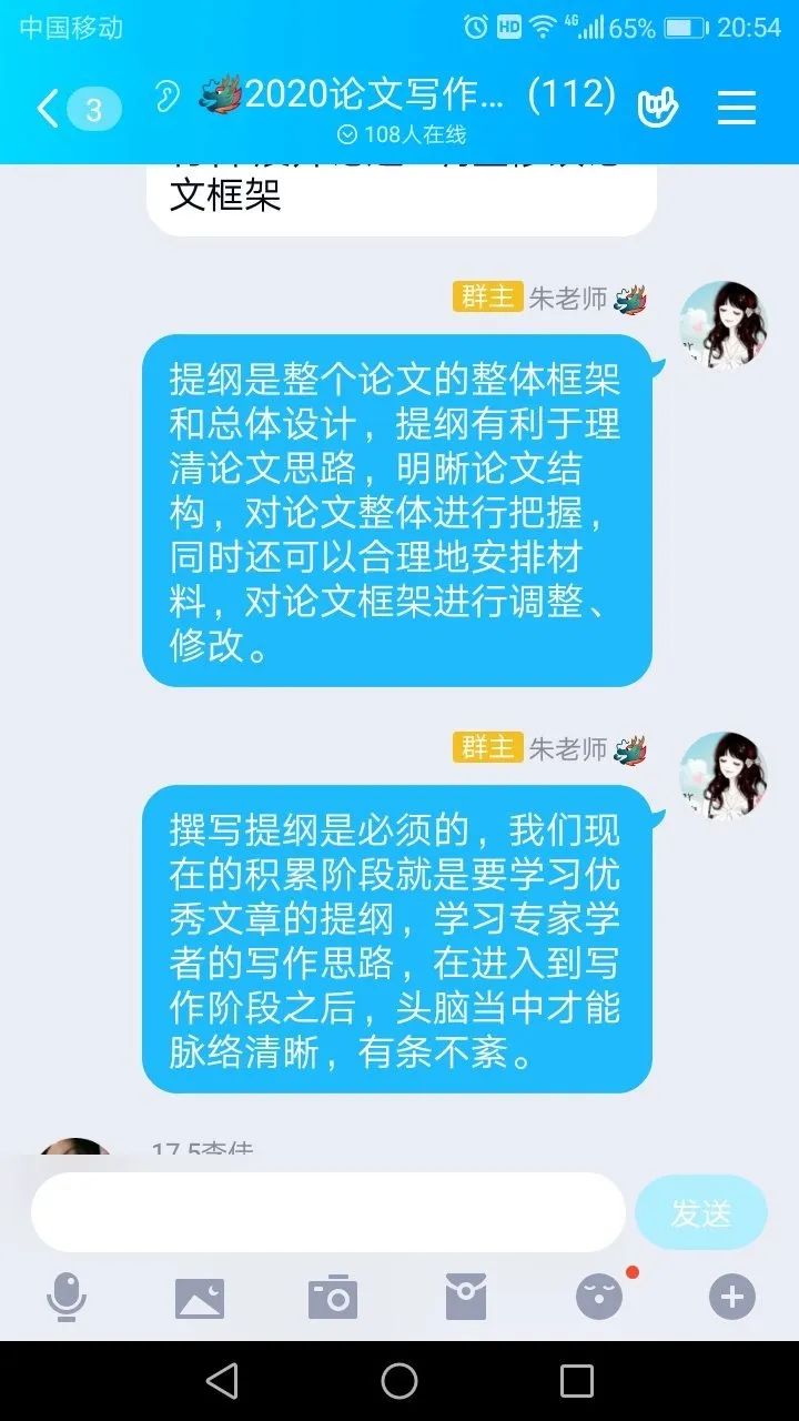 针对线上教学缺少面对面的现场感觉,朱老师根据不同的课程采取不同的教学形式。对于《论文写作》等理论课程的教学,采用优秀慕课资源+腾讯QQ群课堂讲解的模式,教学过程中结合对大量文章的解读和分析,并提出具有思考价值的问题,组织学生参与讨论,及时检验学生听课状态,不断将教学引向深入。