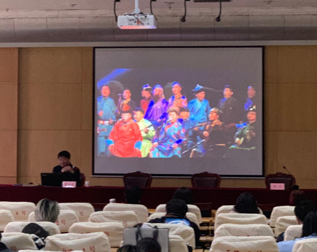 接下来杨玉成教授的讲座主要以高校培养传承人为切入点,简明清晰地阐述了传承班开设的背景和重要性,对濒危体裁及失传曲目的恢复重建提出了新的要求。讲座现场气氛轻松活跃,杨玉成教授还唱了一首蒙古语歌曲《嘎达梅林》让同学们在了解传承的同时,也知道了传承对于自己的意义。最后,杨玉成教授对“学院式”传承人的培养与传统音乐传承新生态的构建和地方性音乐的价值确认功能的问题进行了阐述,表明传承的未来定会革故鼎新。