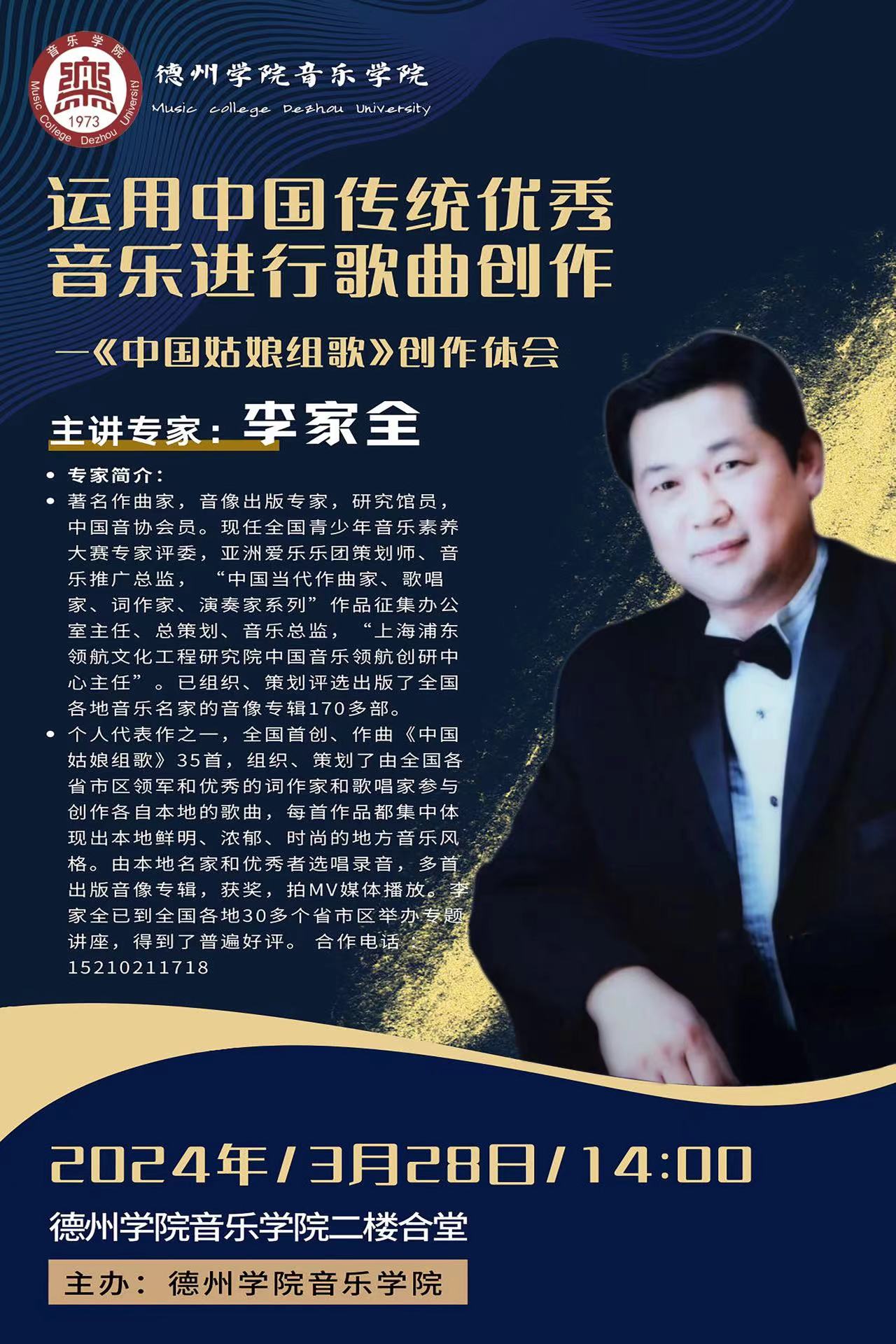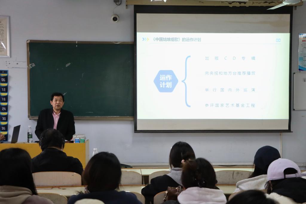 3月28日下午,音乐学院特邀中国著名作曲家李家全教授于音乐楼0349教室举办“运用中国传统优秀音乐进行歌曲创作——《中国姑娘组歌》创作体会”专场讲座。音乐学院党委负责人王桂英、行政负责人段文以及师生160余人参与讲座。