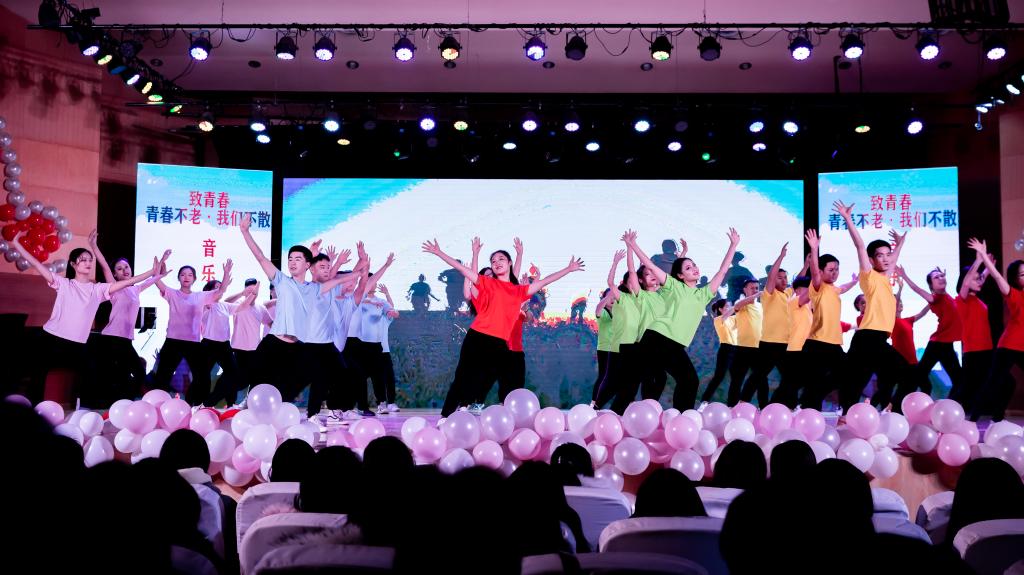 毕业生们为本场汇报音乐会,特意排练了开场集体舞《我们都是追梦人》、民乐合奏《金蛇狂舞》、男女混声四部合唱《不忘初心》和《奉献》。整场音乐会,打破专业方向限制,每位同学都参与到声乐、舞蹈节目中,主持人、灯光、音响以及视频制作也全部由毕业生分工合作,台前台后,配合默契,赢得了在场的领导老师和同学们热烈的掌声。