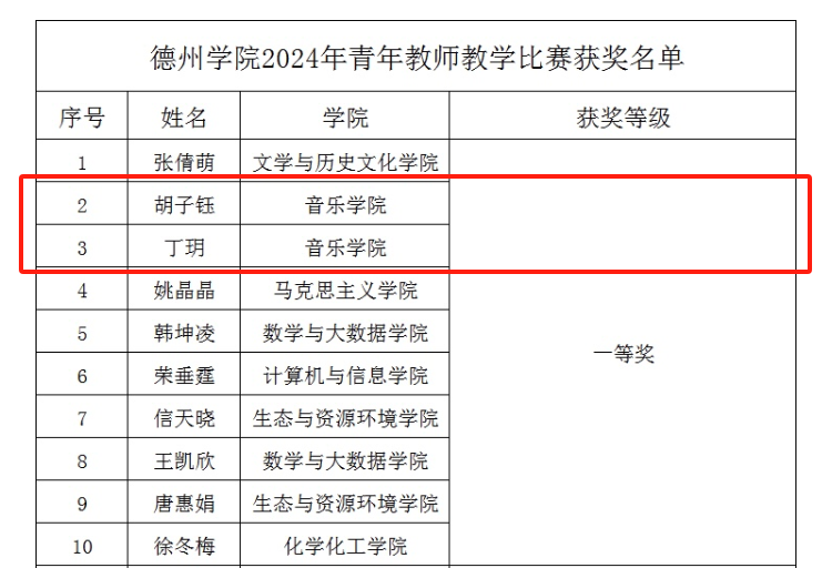 在刚刚落幕的德州学院2024年青年教师教学比赛中,音乐学院两名教师——胡子钰、丁玥凭借出色的表现,两人均获得一等奖。这一殊荣不仅是对她们个人教学水平的肯定,也为音乐学院的教学质量增添了光彩。