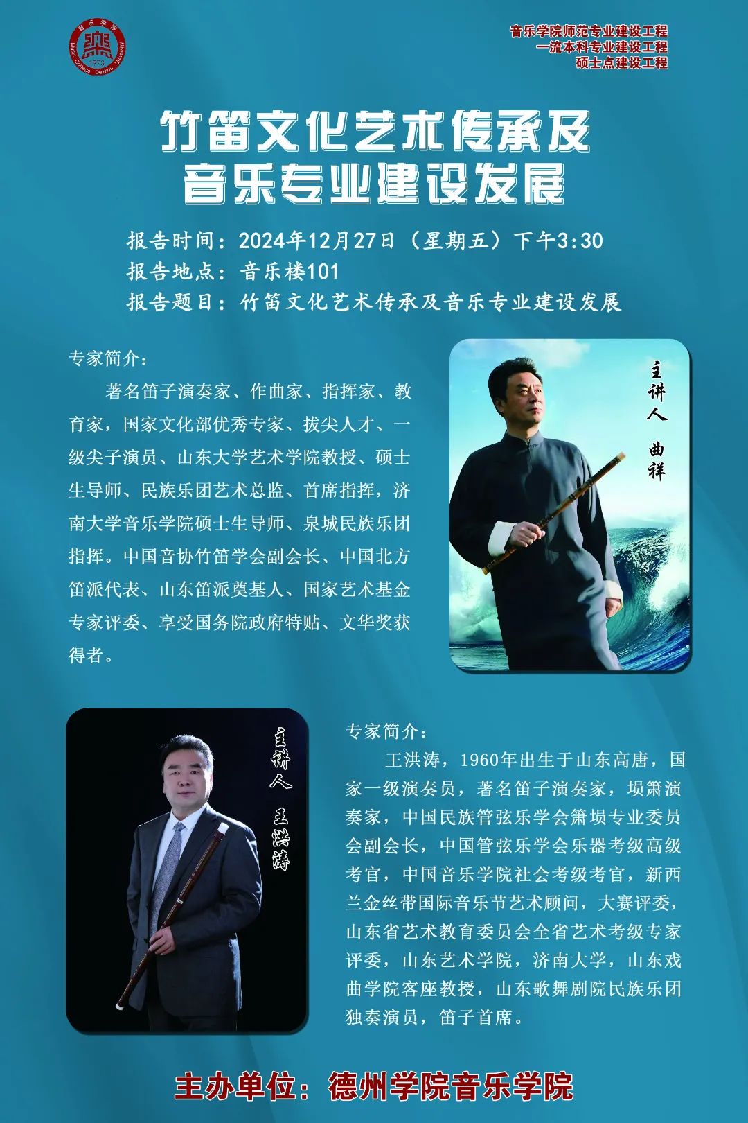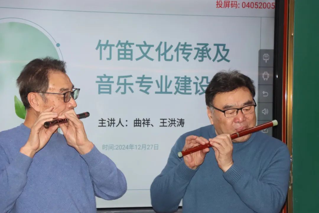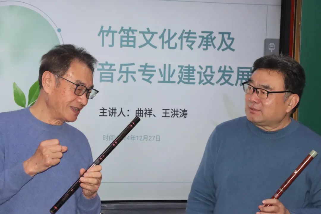 12月27日,我院荣幸邀请著名竹笛演奏家、教育家曲祥教授与王洪涛教授,就“竹笛文化艺术传承及音乐专业建设发展”为主题,为师生们带来了一场精彩的专题讲座。音乐学院领导、竹笛专业学生及各界民乐爱好者50余人共同参加活动。