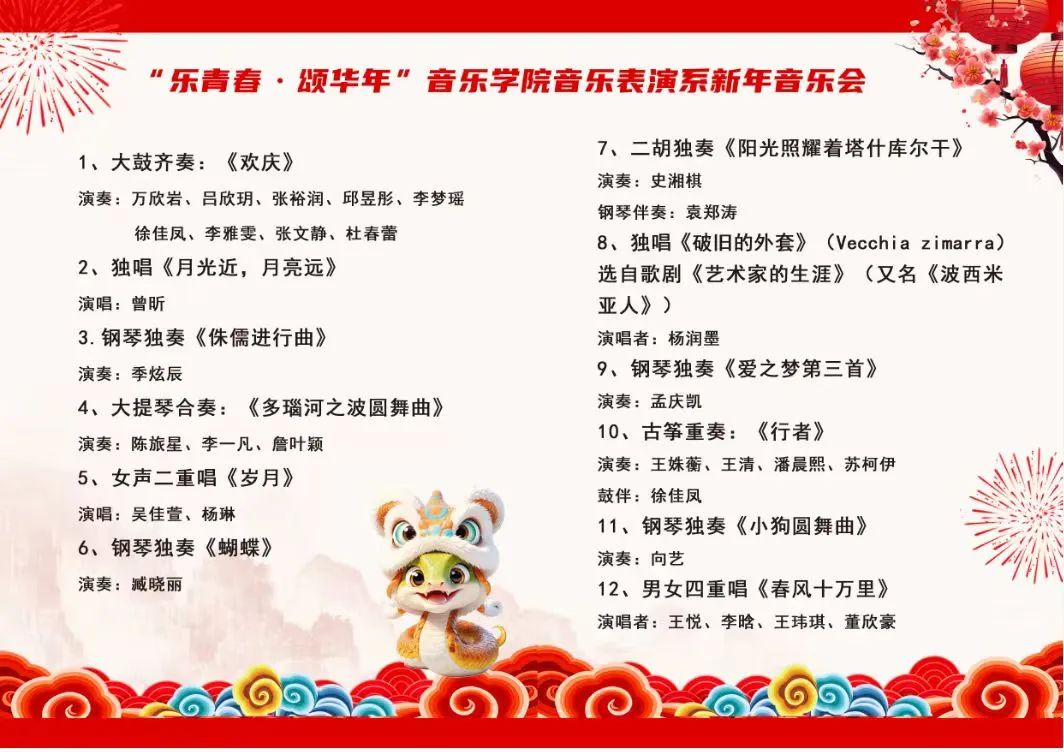 这场音乐会不仅是音乐表演系教学成果的集中展示,更是对新年的美好祈愿与祝福。学院师生用音乐传递情感,用旋律书写青春,在艺术的海洋中迎接新年的曙光,也为校内外观众带来了一场难忘的音乐之旅,开启了充满希望与憧憬的新一年。