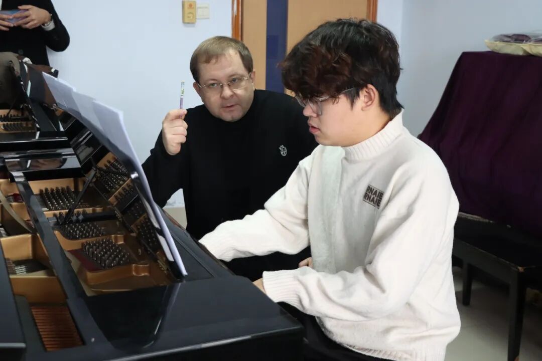 交流环节结束后,伊凡·米舒宁教授前往钢琴教室,为学生开展一对一的课堂教学指导。音乐学院院长马锡骞表示:“此次合作并非单次交流,而是我校与伊凡·米舒宁教授达成的长期合作计划,未来其将以每周的频率进校授课,为学生带来持续的国际化学术指导与教学支持。”