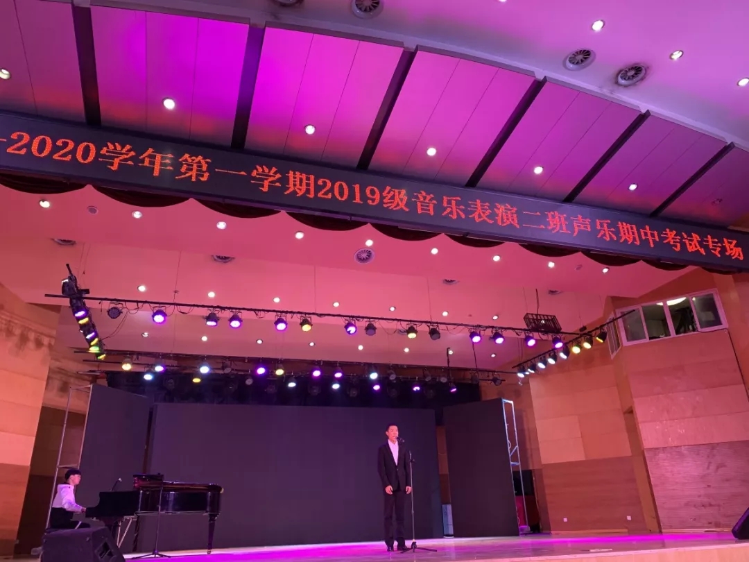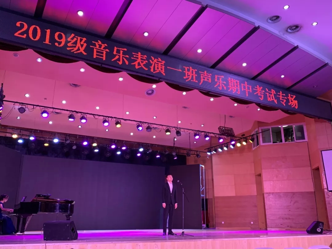 11月14日、15日下午,音乐学院在音乐厅举行了两场别开生面的2019级音乐表演专业声乐期中考试。在学期中间增设一次专业技能课的期中考试,是本学期音乐表演专业落实人才培养目标,加强舞台实践育人的一项教学新举措,是遵循我院强调“抓学风,促教风,不断提高课堂教学质量”的