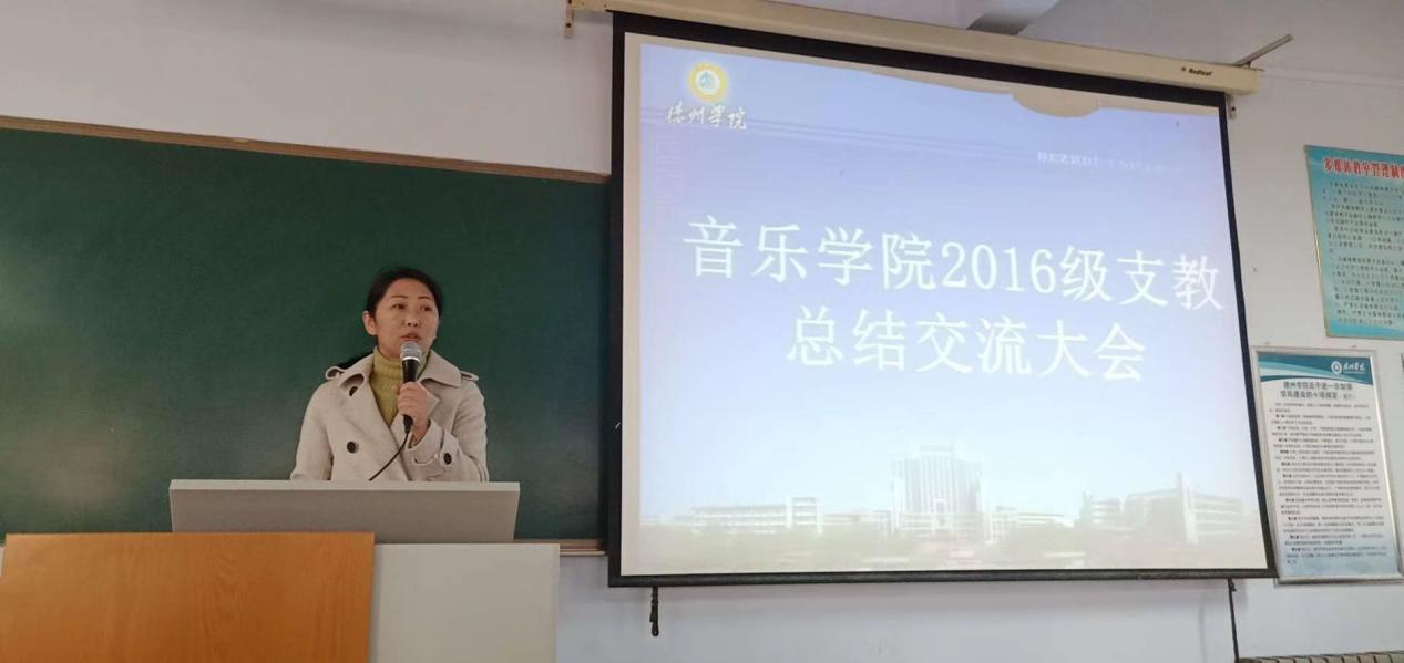 会议伊始,音乐学系系主任杜乡对此次实习支教工作进行了总结,她表示,我院2016级实习支教活动在学院领导的高度重视及各指导老师的相互配合下取得了圆满成功。在支教过程中,同学们充分发扬了吃苦耐劳的精神,不仅出色完成了日常教学任务,还利用自己的专业知识积极服务于当地的音乐基础教育,取得了丰硕成果,并获得了当地教育部门和各支教学校的一致好评。