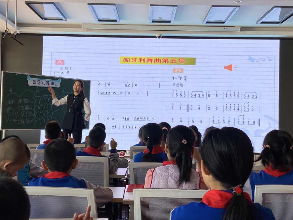 本次观摩课的主讲教师是平原县桃源街道中心小学的齐彤老师。齐老师从节奏、节拍的律动引入课堂教学内容,结合听唱想动等技能,由浅入深地启发学生学习《匈牙利舞曲》,根据乐曲的旋律特点带领学生进行律动学唱,并通过多种形式进行再创作,帮助学生及时巩固、深化所学的知识,充分调动学生的积极性,让学生在实践中体验音乐、感受音乐。