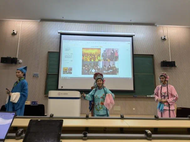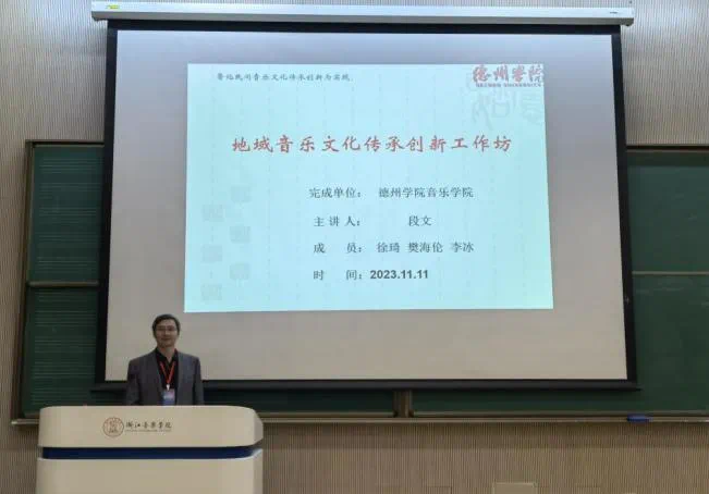 在“传统音乐传承创新实践”工作坊中,主讲人段文教授作了题为“地域音乐文化传承创新”的发言。以德州学院实践案例进行举例论证,从“地域音乐文化传承创新工作坊”非遗项目简介、高校教育传承与创新、问题及对策、图片展示等环节分别对国家级非遗“一勾勾”、省级非遗“古埙制作技艺”、“蹦鼓舞”进行了介绍和阐述。最后,地方戏曲“一勾勾”现场展示了《姊妹易嫁》片段。
