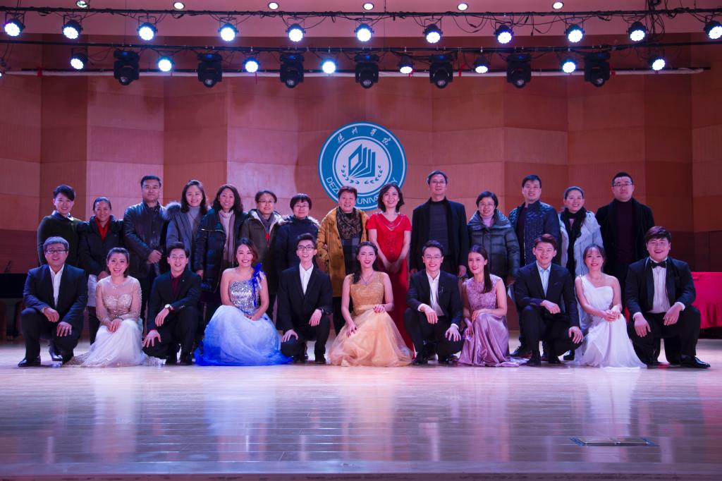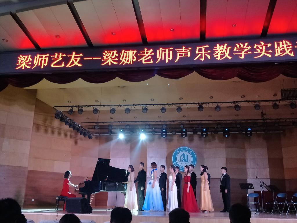 2017年12月5日,音乐学院成功举办“梁师艺友——梁娜老师声乐教学实践音乐会”。本场音乐会曲目类型多样,共13首作品,分为三个部分:中外艺术歌曲,中外歌剧选段,当代创作歌曲。开场形式别具一格,由参加演出同学集体练声,还原课堂情景,艺术歌曲《大江东去》、《红豆词》、《理想佳人》、《想亲娘》有着较强的艺术性和欣赏性,歌剧《唐璜》、《雷娜都》、《运河谣》、《白毛女》片段和咏叹调展示了声乐教学实践的成果,当代创作歌曲《不忘初心》、《大爱有声》、《今夜北方飘着雪花》、《因为有你》博得了观众的热烈掌声,最后以合唱《师恩如歌》结束本场音乐会。