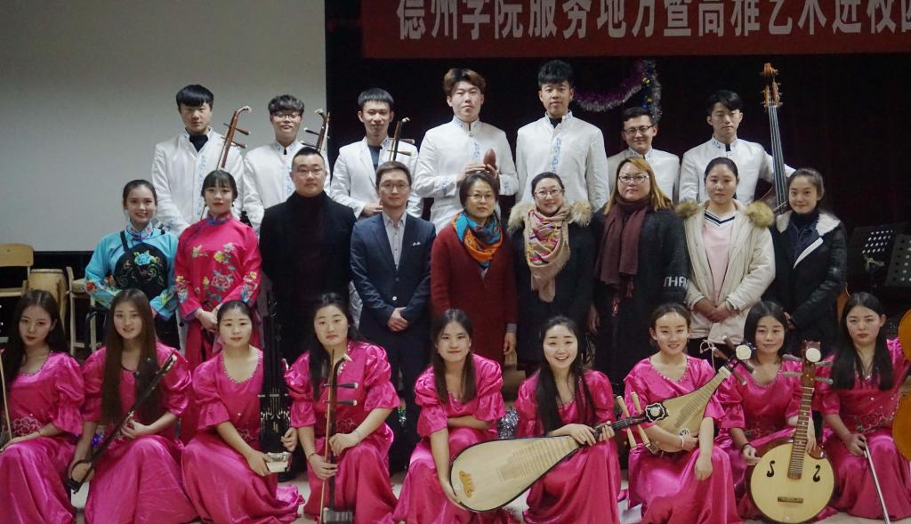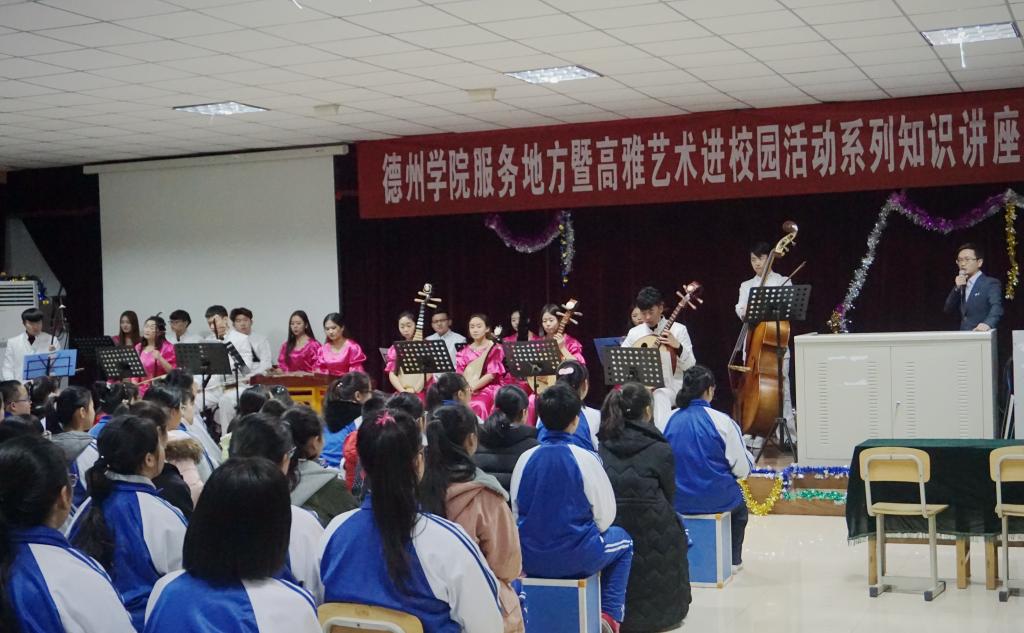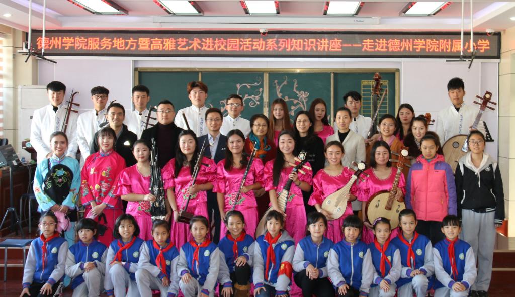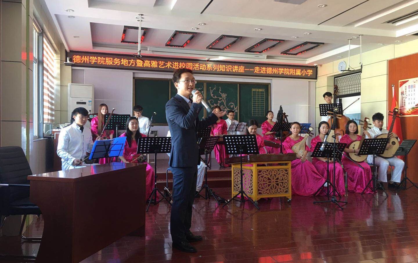2017年11月23日,音乐学院赴德州学院附属小学和德州市第九中学举办了两场“德州学院服务地方暨高雅艺术进校园活动系列知识讲座”,此次活动由音乐学院解淑红主任、马锡骞主任带队,青年教师徐琦博士主讲,“德之韵”民族管弦乐团部分学生参加演出。