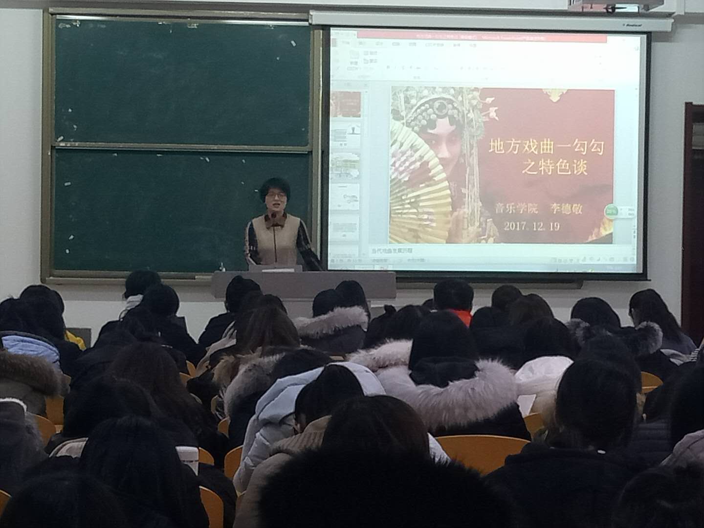 12月19日下午,音乐学院李德敬副教授在博文楼为全校师生作了题为《地方戏曲一勾勾艺术特色谈》的讲座。