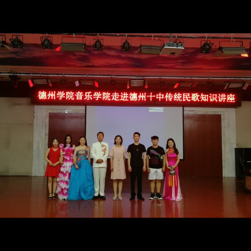 6月14日,山东省暨德州市第十五届社会科学普及活动——德州学院音乐学院走进十中进行传统民歌讲座及展演。首先音乐学院音乐学系声乐教研室主任杜乡开展了传统民歌讲座,分别从民歌的历史发展、民歌的分类、民歌的特点等方面进行了简要的讲解。随后音乐学院学生分别对德州民歌、山东民歌、山西民歌、河北民歌等各地民歌进行了展演,演唱充分展示了各地民歌的风格特点,博得现场观众的阵阵喝彩。演唱过程中杜乡老师边讲解、边导聆,同学们听的聚精会神、津津有味。