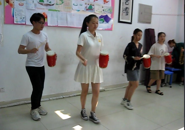 志愿者们的到来,让孩子们非常的高兴,伴随着孩子们热烈的掌声和欢呼声,开始了本次演出的第一个节目:古筝独奏《乡韵》,美妙的旋律在手指间流淌出来,婉婉乡音,悠悠乡情, 道不尽对故土的眷恋, 诉不尽对故土的深情。第二个节目是萨克斯独奏《童话镇》,金属明亮而婉转的声音给孩子们讲述着美丽的童话故事。第三个节目是我院蹦鼓舞社团带来的蹦鼓舞。蹦鼓舞又名跳鼓子,流行于陵县,起源于元朝,现为省级的非物质文化遗产。蹦鼓舞以蹦跳为主,舞姿朴实飘逸,动作幅度大而节奏性强,在大鼓、小鼓、锣、钹、镲等打击乐器的伴奏下,蹦跳扭打,变换着队形,摆出各种阵法,行如游龙浮云,跳似丹凤如林;气势恢弘,刚柔相济,时而象黄河咆哮,时而如流水潺潺,是力与美的完美结合。鼓者左手持鼓,右手握槌,边击鼓边舞,鼓的基本动作为:十字步打鼓、扭步打鼓、踢腿打鼓、射雁跳打鼓、飞脚打鼓、转身打鼓、踹雁打鼓等。蹦鼓舞是优秀的民间传统文化,但是现在在陵城区面临者失传的危机,我院樊海伦副教授、孙晓丹和韩晗老师带领着舞蹈生们学习了这一民间舞蹈,这将有利于蹦鼓舞的传承,有利于民间优秀传统文化的发展。志愿者们精彩的演出引起了特教培训学校同学们的热烈掌声。接着,跳蹦鼓舞的大哥哥、大姐姐们现场教孩子们打蹦鼓,孩子们学得都非常认真,也都很愿意学,由此也使孩子们充分感受到了我国优秀传统文化的魅力。之后,特教培训学校孩子们为了感谢大哥哥、大姐姐的到来,也献上了精彩的节目。首先是非洲鼓合奏《红山果》,之后,是尚安冉小朋友的独唱《相信梦想》,他们的演出也是非常的精彩,打动和感染着在场的每一个观众。