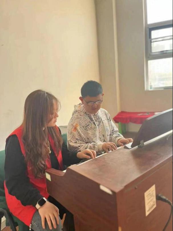 涓滴之水成海洋,颗颗爱心变希望。近些年来,特殊儿童群体逐渐引起社会关注,为帮助特殊儿童,给他们给予更多的关爱,让他们快乐、健康成长,音乐学院志愿者每周二至特殊教育学校开展关爱特殊儿童活动。在特殊学校教室里,志愿者结合自身专业优势对特殊儿童开展声乐、乐器、舞蹈等教学。孩子们小心翼翼地摸着琴键,用手触碰一张张乐谱,用心倾听音符的跳动,感受音乐带来的魅力。