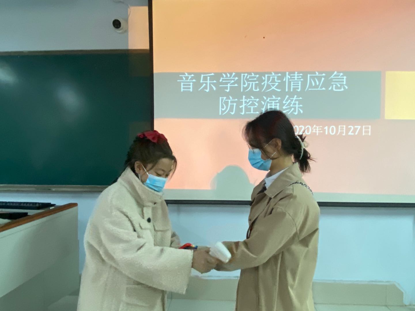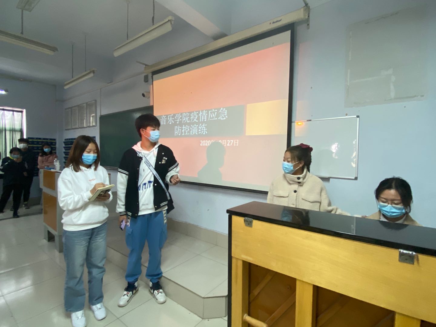 为进一步落实学校疫情防控要求,全面落实疫情防控应急时期学生熟练掌握疫情应急处置流程,10月27日中午音乐学院就学生宿舍体温异常和学生在教室自感体温异常在二楼合堂进行应急处置模拟演练。