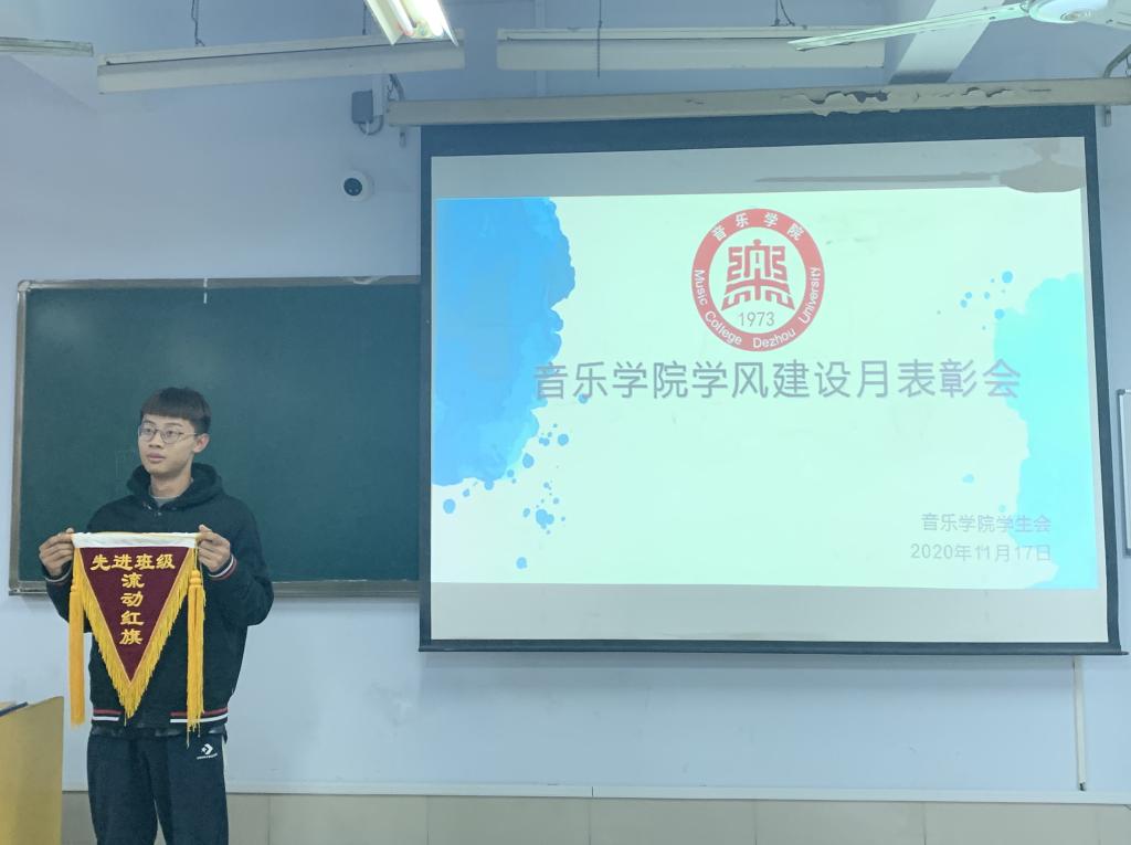 学风建设是学院建设的重要组成部分,也是学生成才的关键所在。为了加强我院学风建设,提高同学们的学习意识,创造一个良好的学习风气和学习氛围,11月17日,音乐学院在0349教室召开学风建设月表彰会,大会向优秀班级20级音乐表演二班颁布流动红旗。