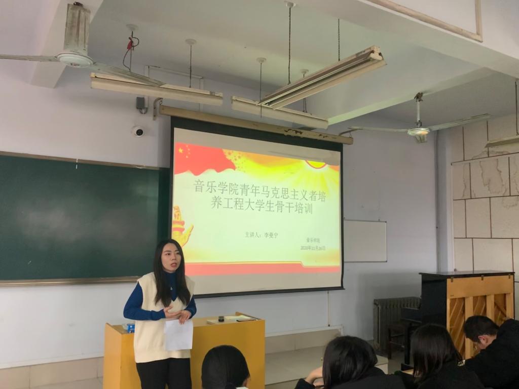 11月26日,音乐学院青年马克思主义者培养工程大学生骨干培训在三楼合堂召开。本次主讲人为音乐学院辅导员李曼宁。二十七届全体学生会成员参加此次培训。