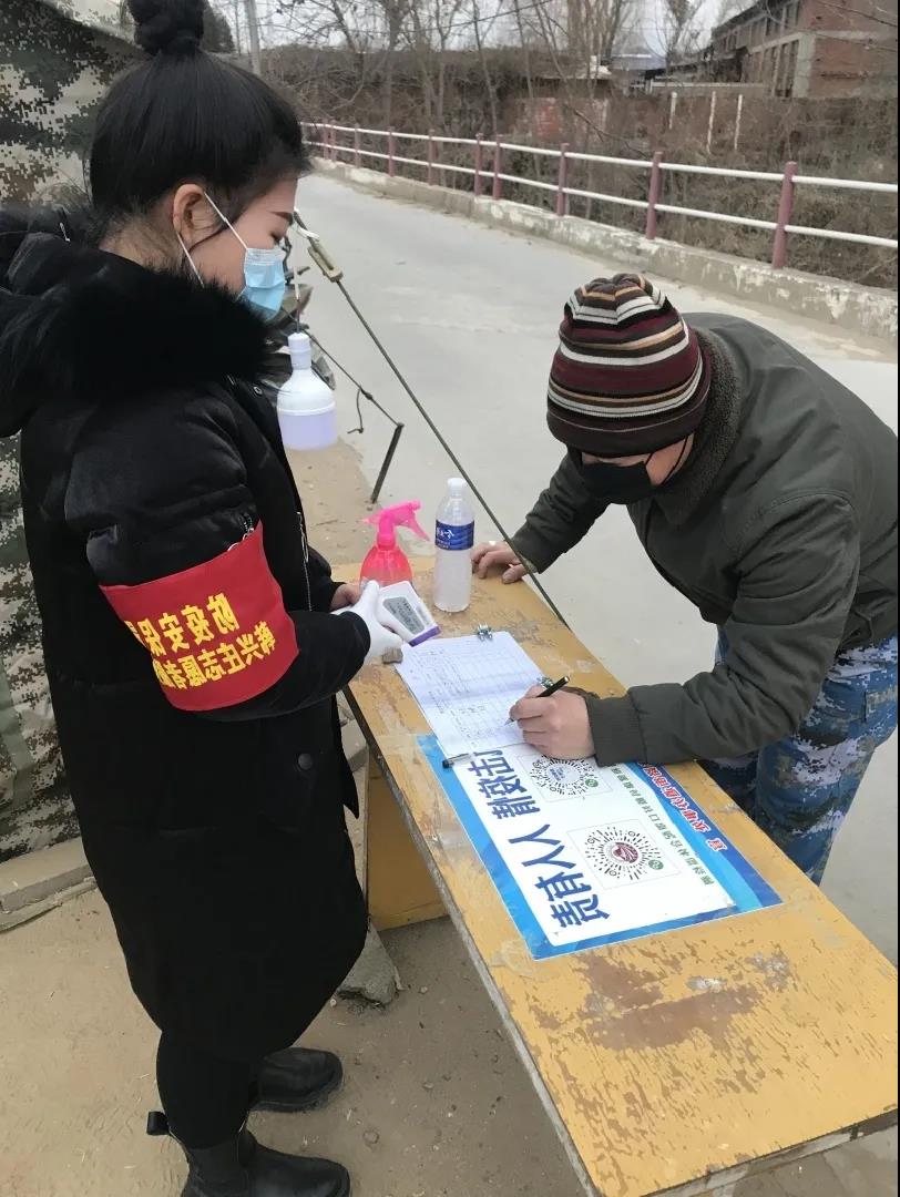 她在河北省秦皇岛开发区韩兴庄村口做志愿者服务,在防疫志愿服务中她的工作是:为出入的村民消毒,测量体温及返乡人口信息记录。
