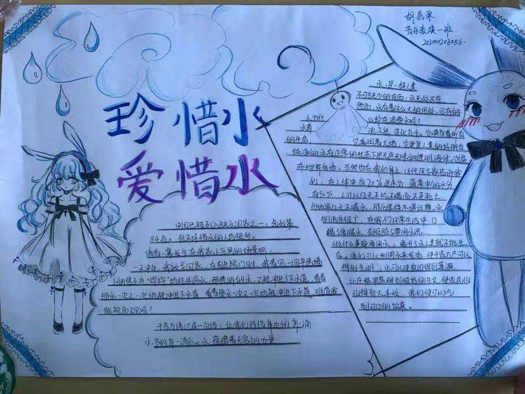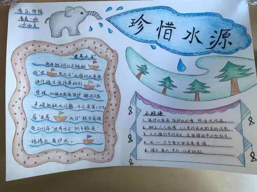 本次活动以手抄报的形式来呼吁大学生节约用水,爱护水资源。作品中,节约用水的主题突出、内容丰富,造型设计有创意,艺术感、氛围感强烈。 最后每个班级选出三份优秀手抄报作品,予以鼓励表扬。