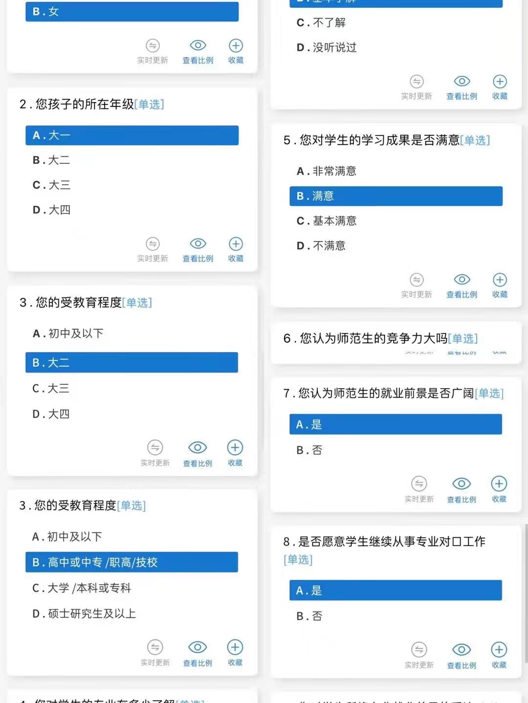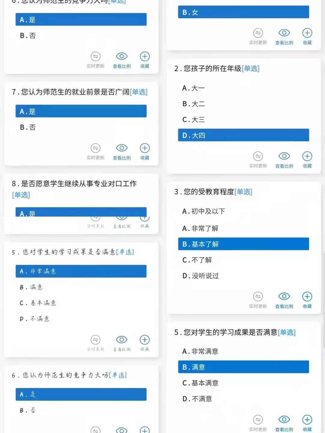 为保证这次调查活动的真实、客观、公正,采取了线上家长无记名填写问卷的方式进行调查。音乐学院约有五百名家长积极参与此次活动。问卷一共有十个问题,含有八个选择题和两个简答题。其中内容包括家长的受教育程度,对自己孩子所学专业的了解程度以及对师范类就业前景的看法等。问题精准确切,内容详细且丰富。调查结果中,多数家长对自己孩子的所学专业基本了解,有93%的家长认为师范生的就业前景非常广阔。