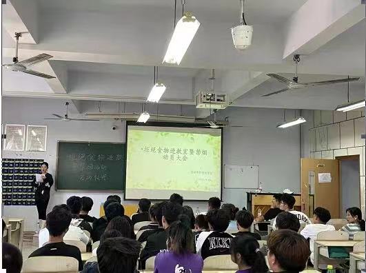 活动开始,参会师生共同观看了拒绝食物进教室宣传片。随后各班代表上台发言,阐述自己的看法与见解,并作出承诺。之后由主席团代表张科磊发言,他表示,参会成员和学生干部要以身作则,率先不将早餐带入教室,以自己的行为影响和感染周围同学,共同来营造干净整洁的校园环境。最后,由老师代表禹亚辉做大会总结,对涉及本次大会主题的学校规章制度进行展示与讲解,强调了本次活动的重要性与目的性。拒绝早餐进入教室,不仅为师生营造良好的教学和学习氛围,同时也能提高同学们的卫生健康意识。