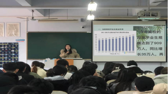 就业指导老师为在场的毕业生讲述了近几年就业形势,受疫情和政策影响,应届毕业生的就业压力愈加沉重,引发学生对自己未来发展的思考。毕业生应积极寻找合适的就业岗位,实现多渠道就业。她又提醒同学们学生要调整心态,脚踏实地,根据自己的实际情况抓住就业机会,这使同学们受益匪浅。