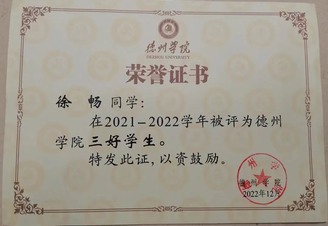 徐畅,中共预备党员,音乐学院2021级音乐学专业学生。曾任音乐学院第29届学生会文体部部长,现任2021级音乐学二班团支书,音乐学院第30届学生会主席。2022-2023学年综合成绩位于专业第一名,曾获德州学院综合一等奖学金、综合二等奖学金,德州学院“三好学生”、“优秀共青团干部”等荣誉称号。