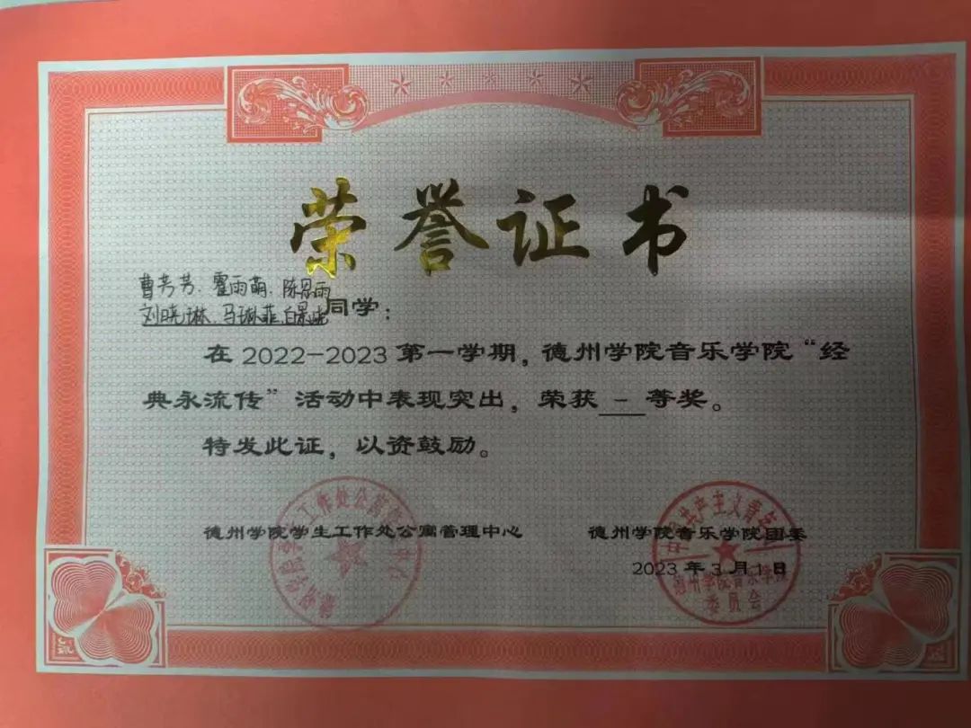 大一刚开学时,加入了音乐学院学生会学习部,在此期间学会了许多技能,也参加了很多志愿服务活动,同时也参加了军乐团,连续两年参加德州学院运动会开幕式闭幕式。有着勤奋刻苦,且很强的自主学习能力。不仅能很好地掌握课堂知识,还会主动阅读大量的专业相关书籍和文献来拓宽知识面。在社会实践方面,积极参与各种活动。充分发挥领导才能,带领团队成员出色地完成了任务,获得了社区和学校的表扬。
