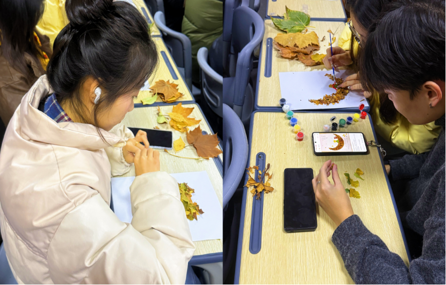 活动前,学习部精心筹备,不仅提前收集了校园内的银杏叶、梧桐叶、枫叶等各类秋日落叶,还在教室内备好画纸、胶水、剪刀等创作工具,为同学们营造了温馨舒适的创作氛围。活动中,学子们充分发挥想象力,将自然素材与艺术灵感巧妙融合:银杏叶层层叠叠,铺成充满暖意的小木屋屋顶;还有同学将落叶与音符元素结合,勾勒出跳动的五线谱。大家或独自专注构思,或三五成群交流协作,原本普通的落叶在同学们手中被赋予了全新的生命与意义。有同学表示:“拼贴作品的过程特别治愈,让我在忙碌的专业课学习中找到了放松的出口,也发现了生活中的小美好。”