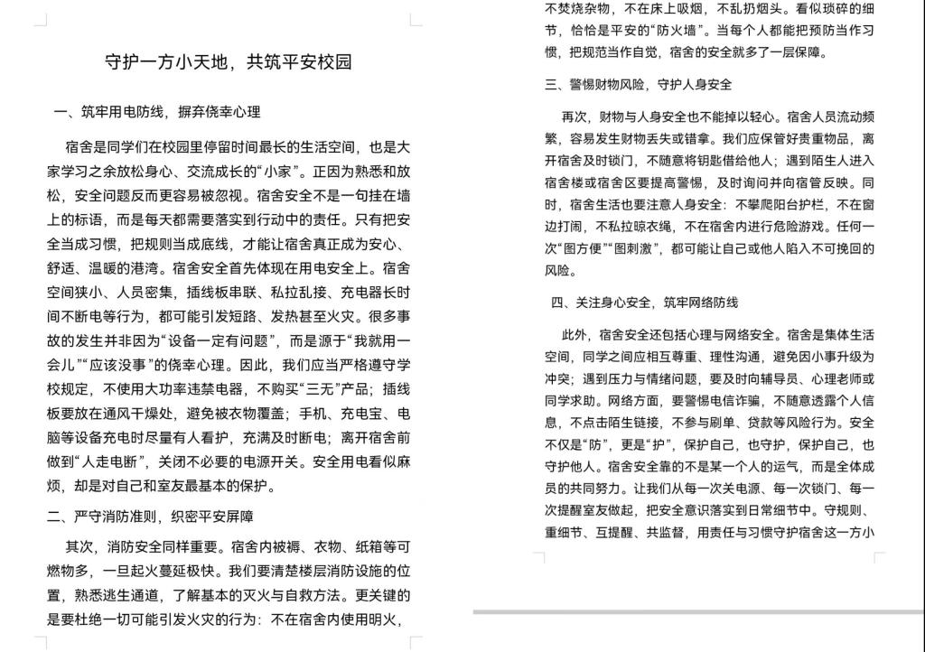为切实增强全院学生安全防范意识与责任担当精神,推动安全文化融入宿舍生活,近期,音乐学院面向全年级学生开展“以文聚力护平安 青春担当筑防线”宿舍安全主题征文活动。