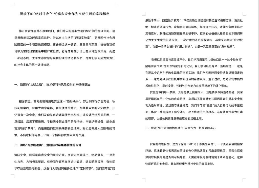 征文活动聚焦宿舍生活中可能涉及的用电安全、消防安全、财物安全、人身安全以及人际交往安全等多个维度,鼓励同学们围绕真实案例、潜在风险、防范措施、责任共担等方面进行创作。同学们踊跃投稿,稿件体裁多样,包括议论文、记叙文、倡议书等。文章或剖析违规使用电器、私拉电线的危害,或讲述身边发生的安全小故事与教训,或提出共建安全文明宿舍的务实建议,字里行间流露出对生命的敬畏、对规章的尊重、对“小家”平安的责任感。学院团委及学生会对来稿进行认真审阅、分类整理与综合评价,不仅评选出优秀作品,更将其中反映的普遍性问题和建设性意见汇总,作为改进宿舍安全管理与服务的重要参考。经过综合评比,共选出优秀征文15篇,分获一、二、三等奖。