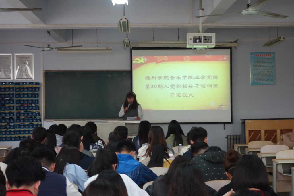 4月10日下午四点,音乐学院在二楼合堂举办业余党校第30期入党积极分子培训班开班仪式,音乐学院党总支书记高莉出席,政治辅导员吕萍主持,全院四十余名入党积极分子参加。