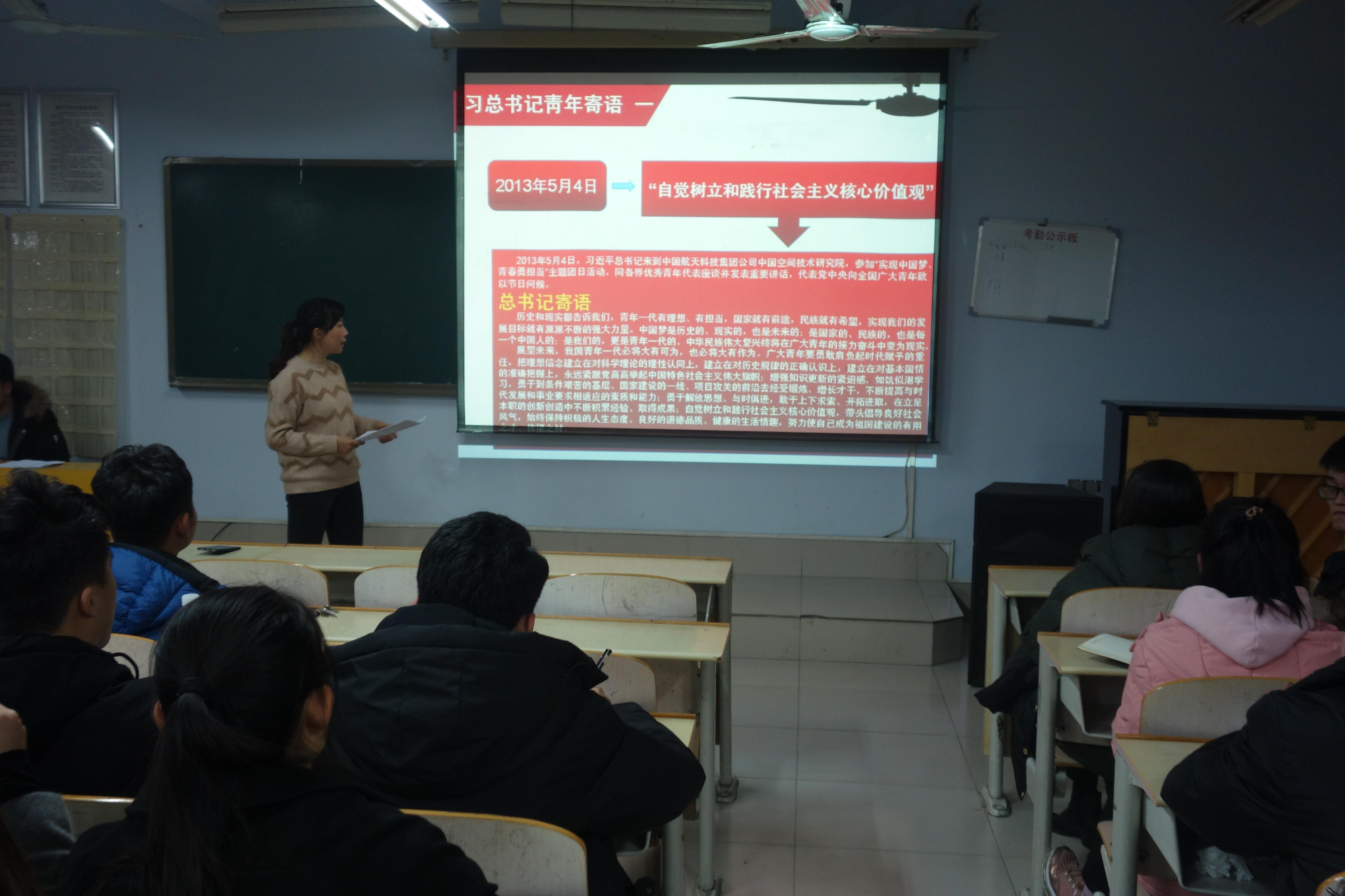 党总支副书记贺昱通过对“习近平寄语青年”的论述引出社会主义核心价值观。她分别从国家、社会、个人三个层面对二十四字社会主义核心价值观进行详细解读,并结合大学生实际着重地分析了如何将爱国、敬业、诚信、友善运用到生活中。她指出,大学生应该积极响应“三个倡导”,爱党爱国立身做人,勤学善思立志成才,历练本领立业为民。把文化知识学习和思想品德修养紧密结合起来,做到德才兼备;把创新思维和社会实践紧密结合起来,勇于创新,提高创新思维能力;把全面发展和个性发展紧密结合,在社会大家庭中保持个性彰显自我。