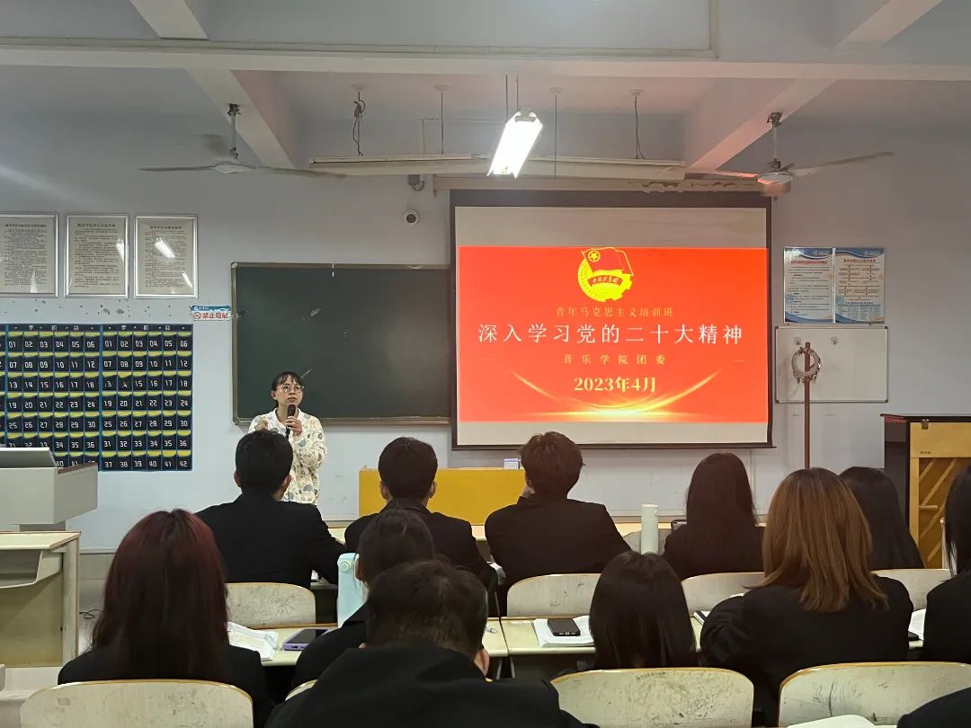 为深入学习习近平新时代中国特色社会主义思想和党的二十大精神,用党的科学理论武装青年,用党的初心使命感召青年,4月19日,音乐学院在0247教室开展“青马工程”培训。本次课程由音乐学院团委书记陈璨主讲,音乐学院青马班学员参与学习。