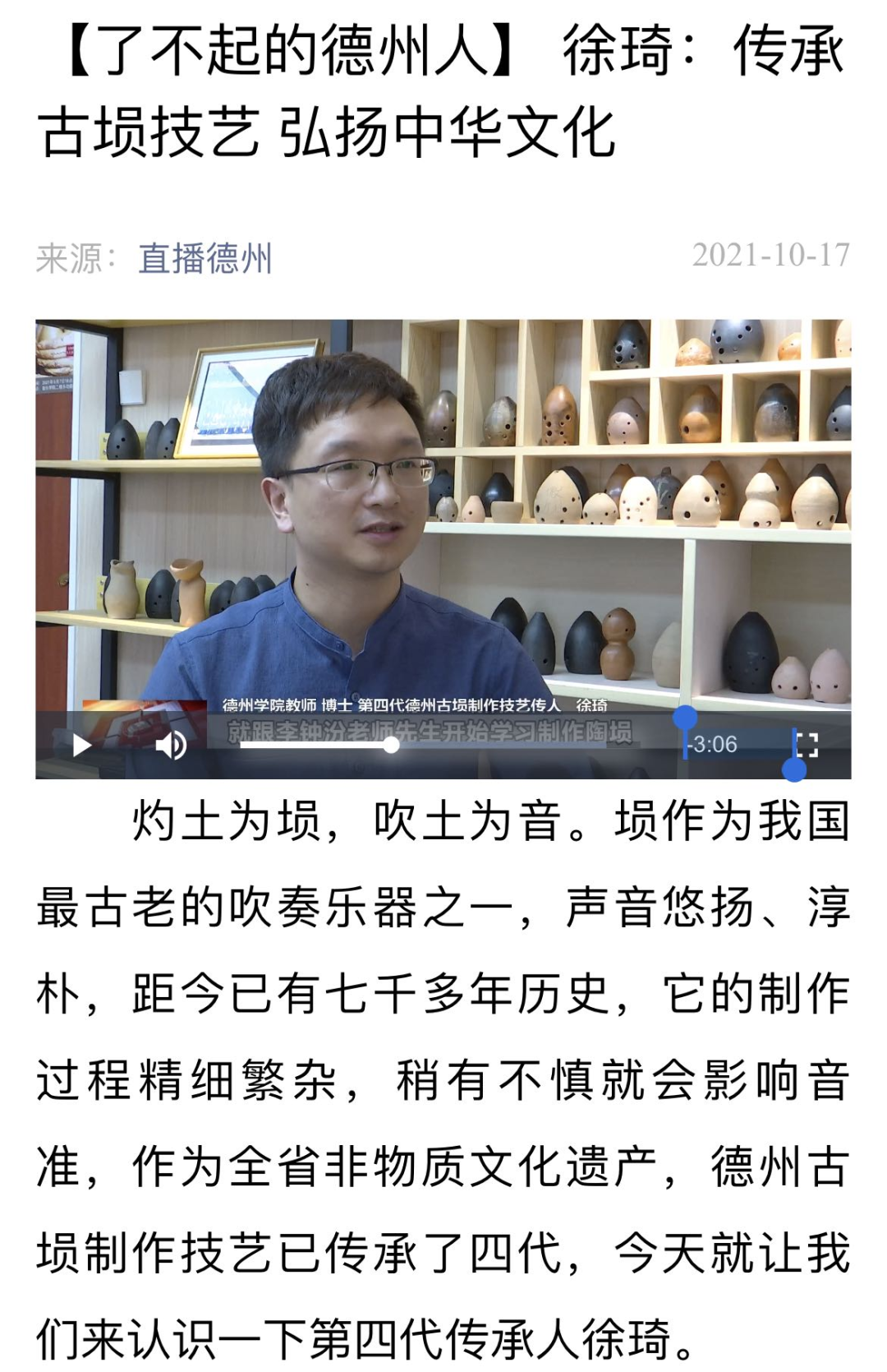 徐琦作为非遗传承人,一直对“德州古埙”进行保护与研究,并积极培养高校学生作为传承人。高校教育传承在保护非物质文化事业中的作用是非常显著而巨大的,徐琦主讲的《陶埙演奏与制作》课程,一定程度上解除了演奏及制作工艺传承的后顾之忧,使得“德州古埙制作技艺”这一珍贵的民间文化遗产以一种更加积极的方式传承下去。