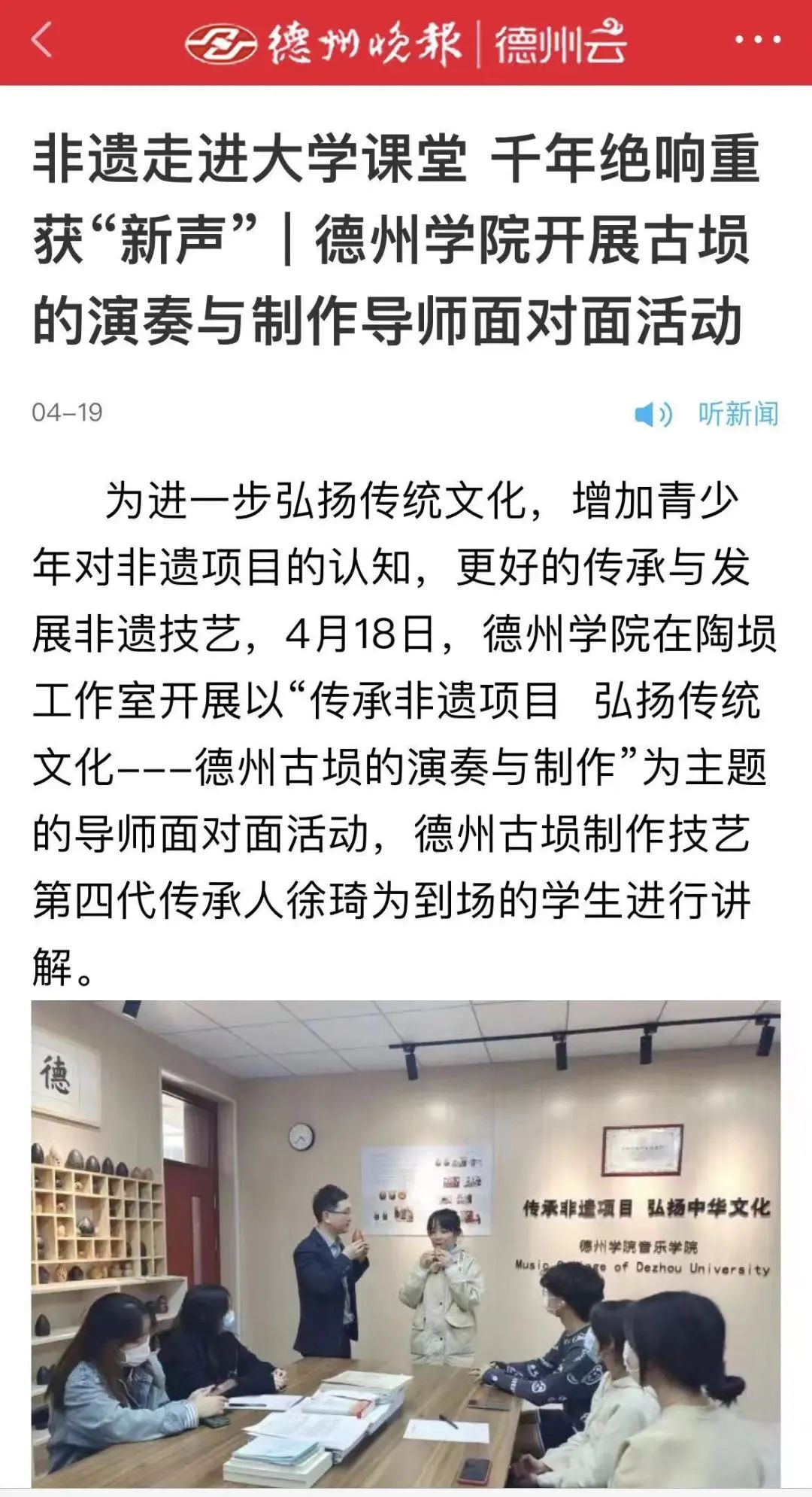 21. 主讲讲座,德州学院“导师面对面”系列活动——德州古埙的演奏与制作,2022年4月18日。