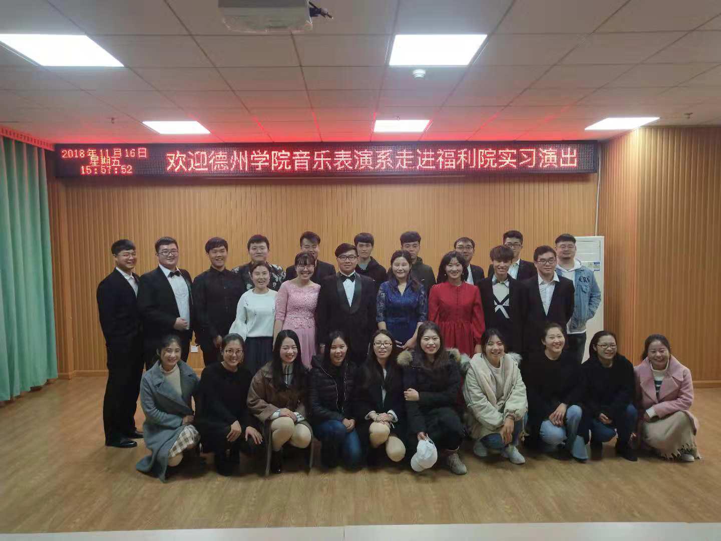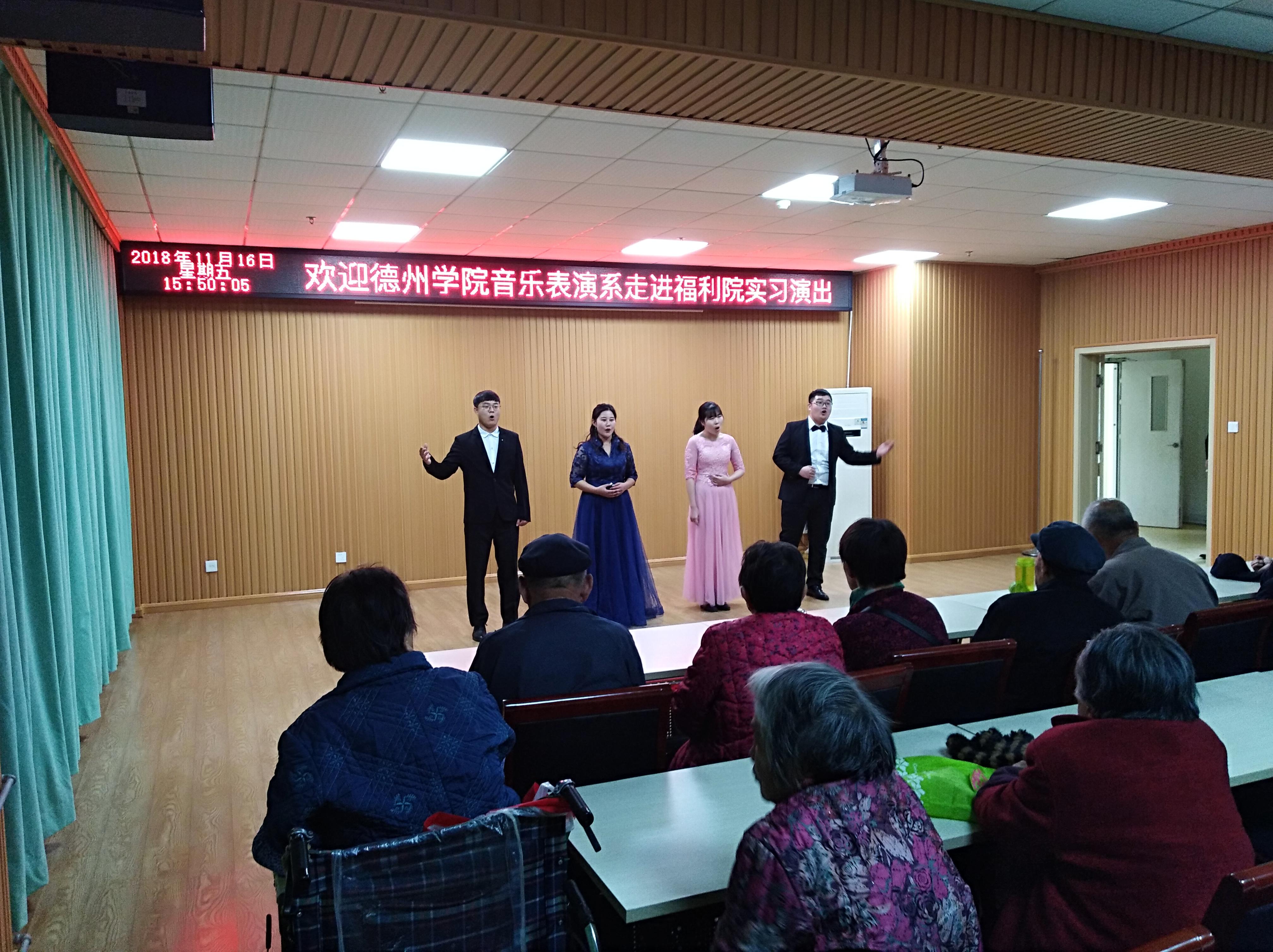 11月16日下午,我校音乐学院2015级音乐表演系学生在敬老院举办“德州学院音乐学院走进德州市福利院慰问演出暨音乐表演系毕业实习演出”活动,本次演出由音乐表演系器乐舞蹈教研室主任任陆以及音乐表演系声乐教研室主任薛莲带队,由2015级音乐表演系学生参加演出。