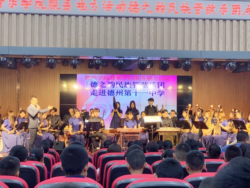揭牌仪式之后,“德之韵”民族管弦乐团在报告厅为学校师生举办了专场音乐会。音乐会由乐团指导老师徐琦博士导聆,50余名团员参与演出。徐琦老师介绍了民乐团的组成部分:吹、拉、弹、打,之后对各个乐器进行了讲解,并由乐团团员示范演奏。音乐会中既有描写德州古运河民俗风情的吹打乐《千年运河展新颜》;策马奔腾、铁蹄铮铮的二胡齐奏《新赛马》;又有曲调欢快、展现红军革命斗争中乐观主义精神的民乐合奏《毛委员和我们在一起》;还有薛莲老师演唱的优美抒情,曲调质朴的民歌《绣荷包》等等。音乐会不仅使乐团团员得到技能的展现,也使第十一中学师生们了解到了民族管弦乐团的基本知识,更提高了学生们对于民族音乐文化学习的积极性。