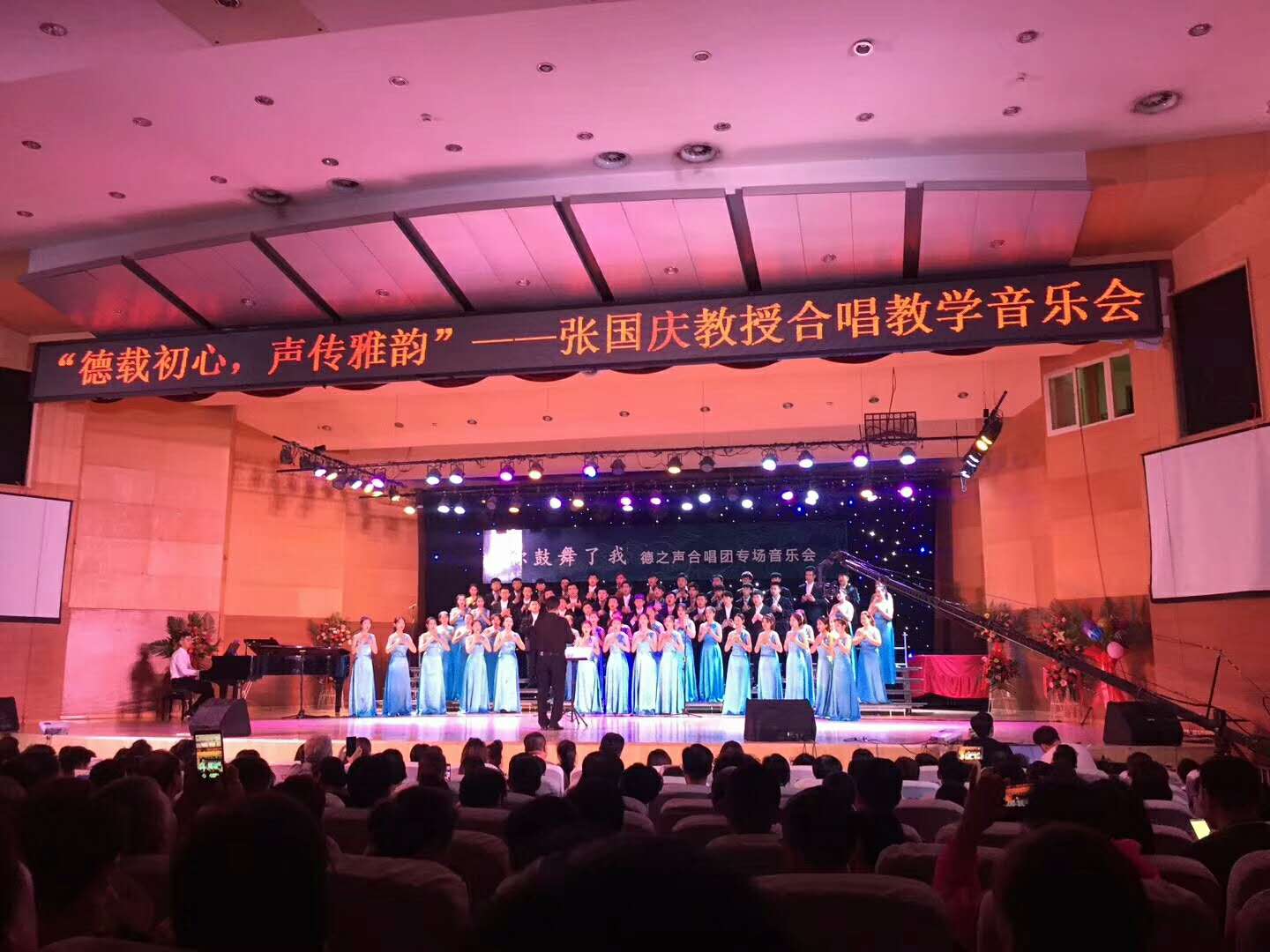 6月23日晚7点半,音乐学院于音乐厅举办了“德载初心,声传雅韵”张国庆教授合唱教学音乐会。德州学院校长赵胜村,党委委员、副校长张明征、李永平,宣传部部长任立春,德州市人大、政协、文联等各级领导嘉宾,德州学院部分教学单位的领导及音乐学院党政班子成员和部分师生到场观看,德州学院官方微博进行全程网络直播。