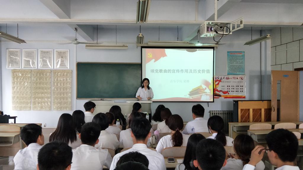 6月27日,音乐学院第二教师党支部书记梁娜为学生党员及入党积极分子们讲述了一堂内涵丰富、生动鲜活的音乐党课。党课以“颂党歌曲的宣传作用及历史价值”为主题,分为“抗日战争和国内革命战争时期”、“新中国成立到改革开放之前”“改革开放至今” 三个篇章,每一篇章均以师生合唱不同历史时期的颂党代表歌曲结束。这堂音乐党课浓缩了红色历史,由师生共同参与,亦学亦唱,在有限的时间内让学生们动心、动情,从而使党课内容入脑、入心。