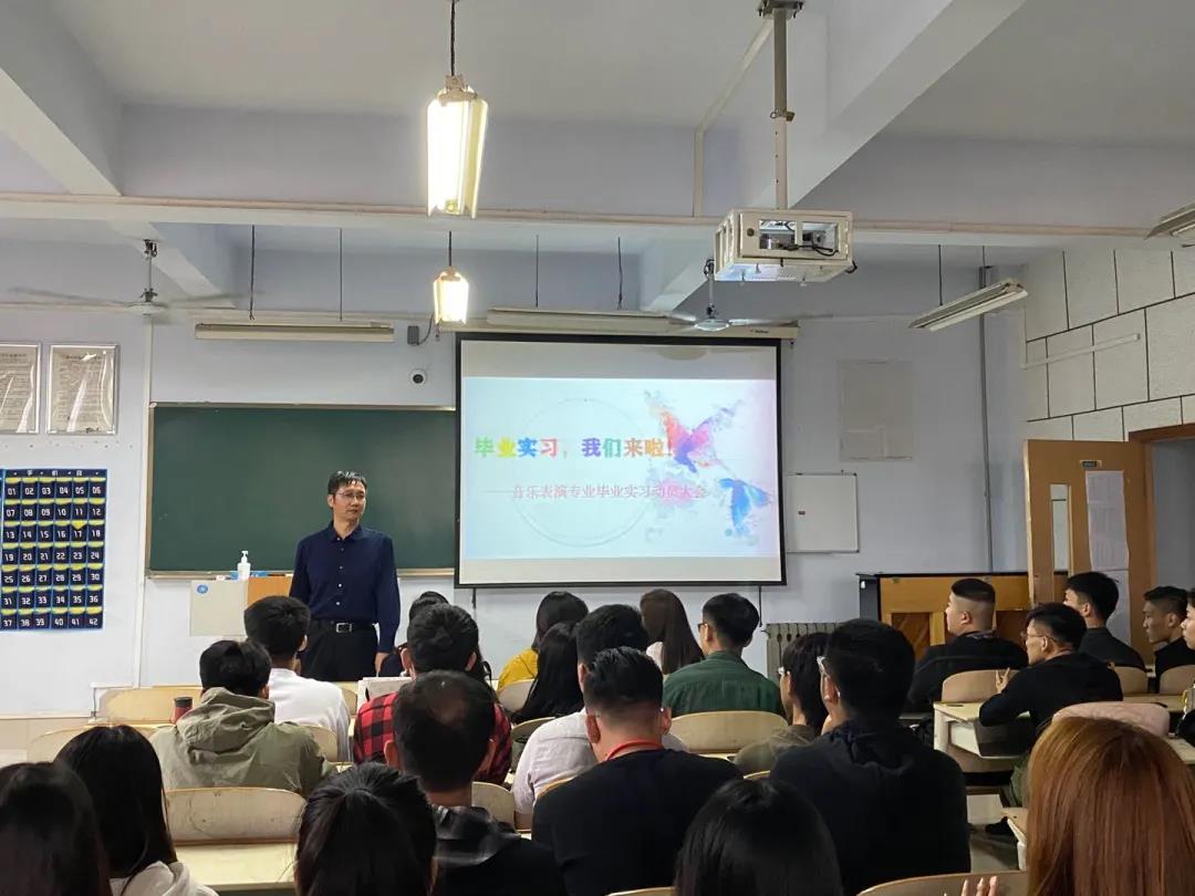 贺昱副书记要求同学们实习期间,要严格遵守各项规章制度,虚心学习,团结协作,圆满完成实习任务。实践教研室主任梁娜对音乐表演专业毕业实习设计进行解读。对校内实习、校外实习的目标、具体任务以及各实习单位的基本情况作了详细的介绍,并向2017级同学展示了往届毕业生毕业实习走入社区、走进中小学校、服务乡村的精彩资料。