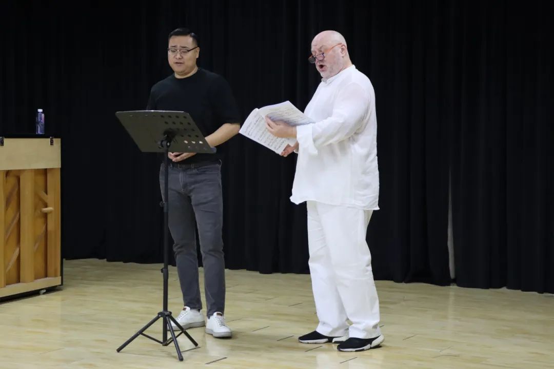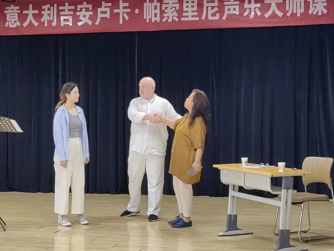 吉安卢卡·帕索里尼教授来自意大利佩萨罗罗西尼国立音乐学院,从事声乐教学研究30年之久,有丰富的舞台演唱与教学经验。本次讲座教授结合演唱曲目,从呼吸控制、发声技巧和如何获得歌唱高位置三个方面分别对我院新入职马瑞、龚娇娇博士和2021级、2022级两名学生进行了细致指导,以示范教学的形式,解决声乐学习中存在的共性问题。担任本次大师课翻译的是天津音乐学院声乐硕士生导师王硌教授,声乐艺术指导孙思学老师。最后,教授与我院青年教师马瑞博士共同演唱歌剧《费加罗婚礼》咏叹调《你赢得了诉讼》,赢得在场师生热烈掌声。