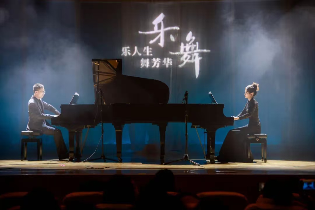 张利鑫、胡子钰老师默契配合,双钢琴奏响《斯拉夫舞曲》,这个作品使德沃夏克一举成为国际知名的作曲家,民族风格的音乐有如一股清新的春风吹入欧洲乐坛,激起人们对民族乐派的浓厚兴趣。