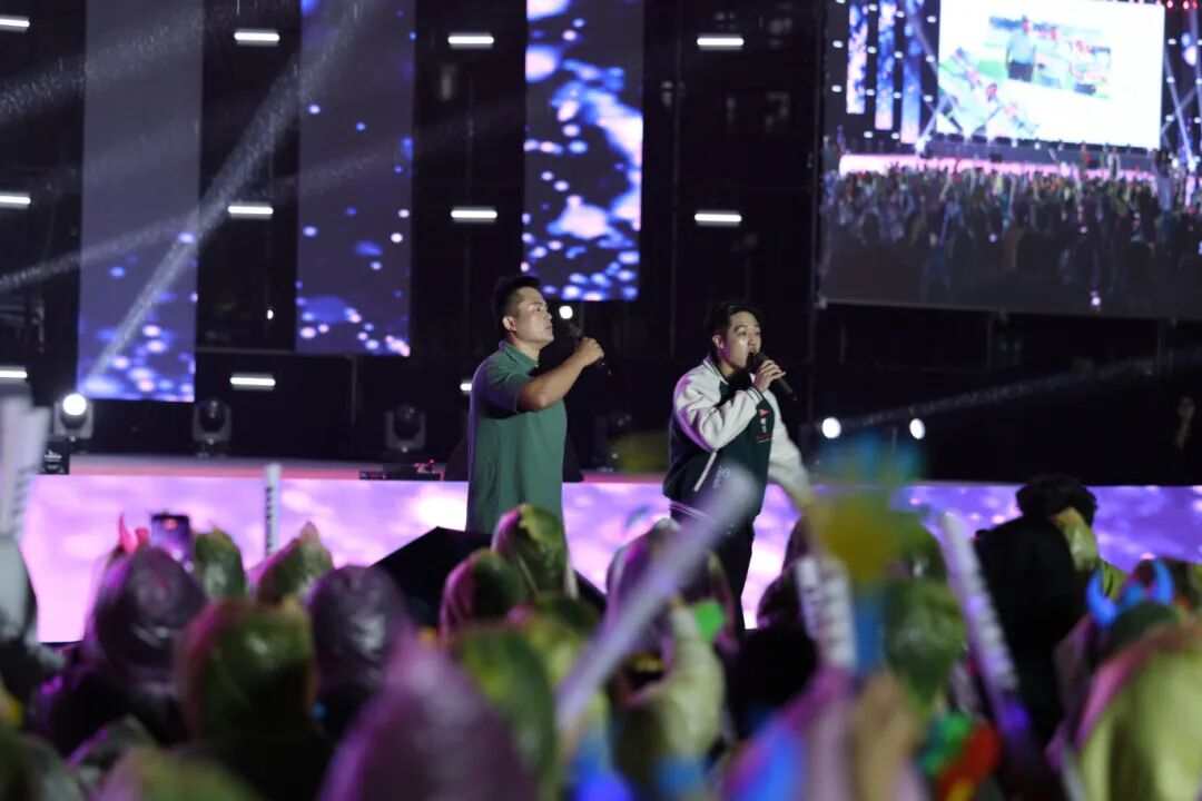 第二篇章以歌曲串烧《改变自己》《少年般绚丽》《淋雨一直走》《再回首》《一起向未来》开场。我院学生李天瑞、夏宇等演唱者们用充满活力的嗓音,将一首首经典歌曲重新演绎,台下的观众们跟着音乐的节奏挥舞着双手,现场瞬间变成了欢乐的海洋。