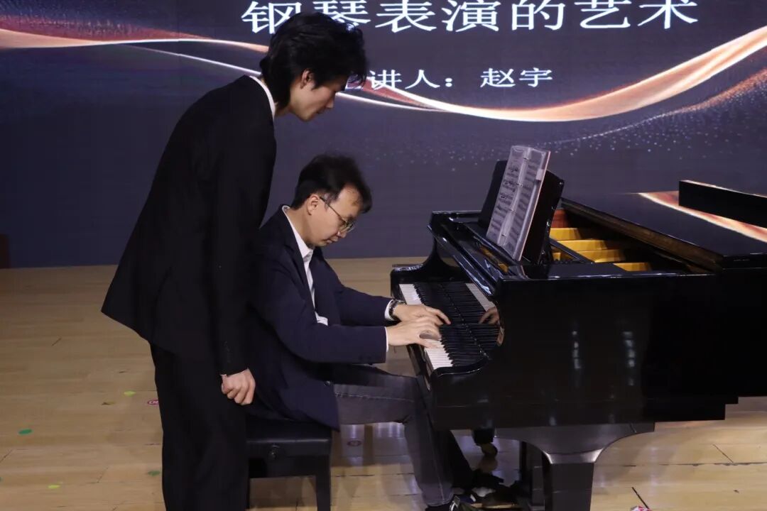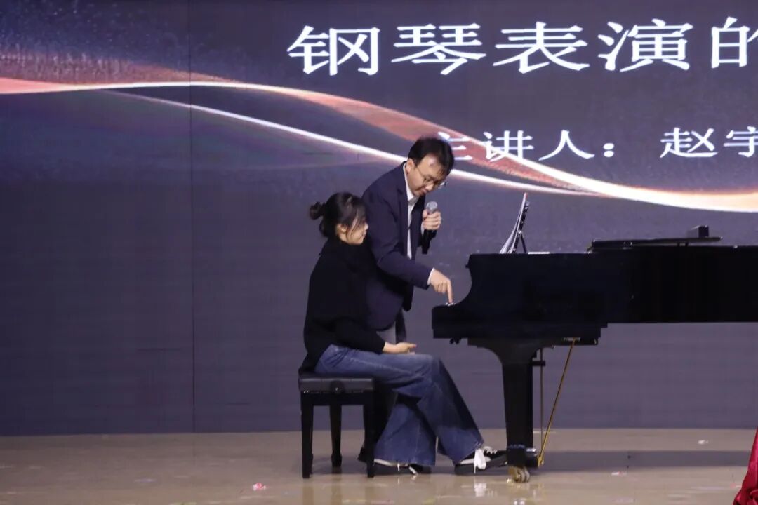 在赵宇教授的钢琴讲座中,三位学生先后登台演奏。第一位学生演绎歌剧改编作品《弄臣》,赵宇教授随即进行指导,深入剖析了作品中戏剧张力的音乐化呈现,并示范如何通过音色对比增强叙事表现力。随后,第二位学生演奏中国作品《山丹丹花开红艳艳》,赵教授着重指导民族和声的色彩运用与地方风格的准确把握,强调在保持原作韵味的基础上进行艺术升华。最后,面对第三位学生带来的高难度技巧作品《钟》,赵教授从触键技巧到声部层次进行逐一解析,亲自示范如何在快速乐段中保持音乐的清晰与美感。整场讲座以"演奏-指导-提升"的互动模式展开,赵宇教授通过精准专业的现场指导,将理论阐释融入每个作品的艺术处理中,使在场师生对钢琴表演的艺术本质有了更深刻的理解。