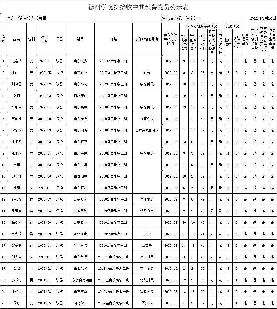 经党组织培养考察,征求党员、群众和培养联系人意见,支委会讨论研究、政治审查、集中培训、党总支审查,拟接收赵春玲等22名同志为中共预备党员。为增强发展党员工作的透明度,接受党内外群众的监督,确保发展党员的质量,根据上级文件精神和《中共德州学院委员会发展党员工作实施细则》的要求,现将拟接收预备党员的基本情况公示如下(名单附后):