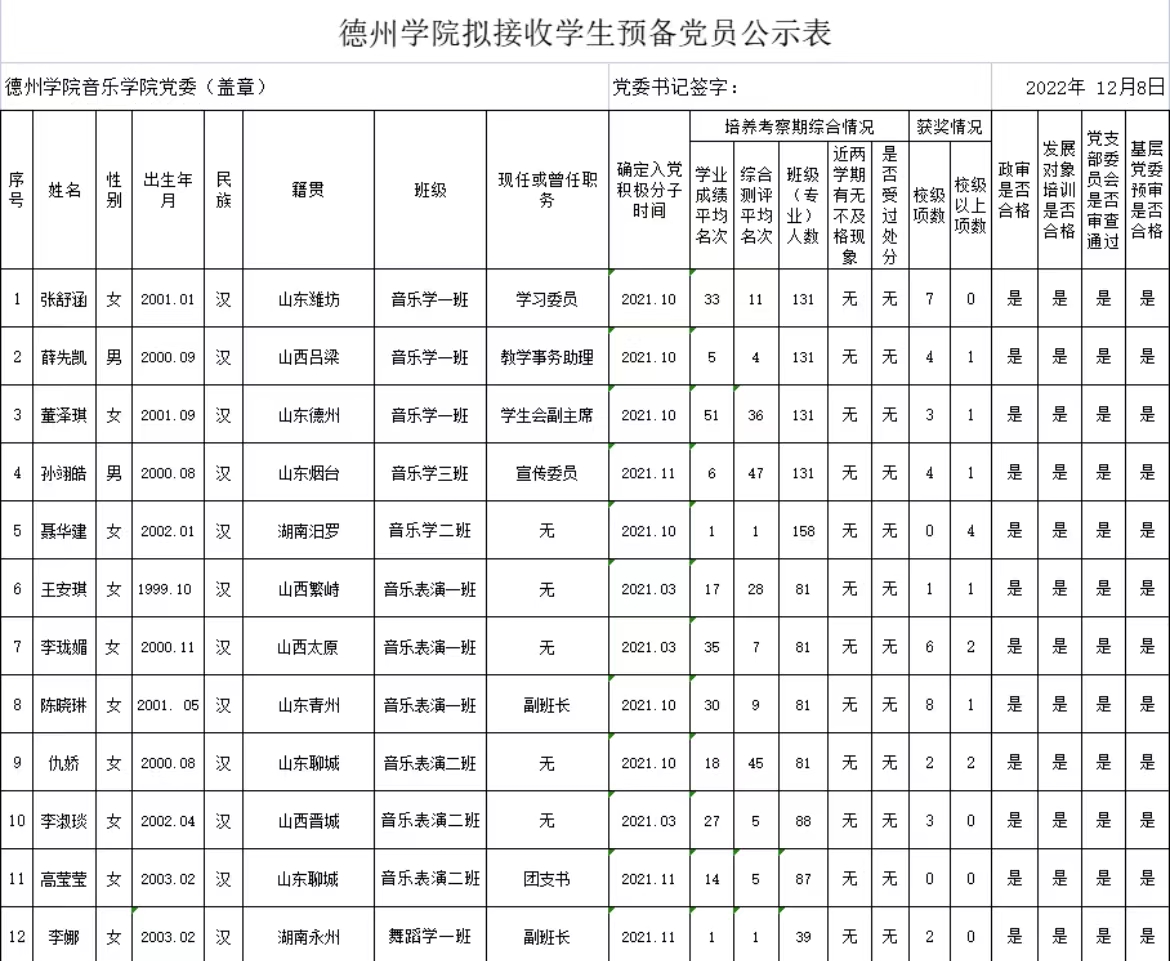 经党组织培养考察,征求党员、群众和培养联系人意见,支委会讨论研究、政治审查、集中培训、基层党委预审,拟接收韩晗等14名同志为中共预备党员。为增强发展党员工作的透明度,接受党内外群众的监督,确保发展党员的质量,根据上级文件精神和《中共德州学院委员会发展党员工作实施细则》的要求,现将拟接收预备党员的基本情况公示如下(名单附后):