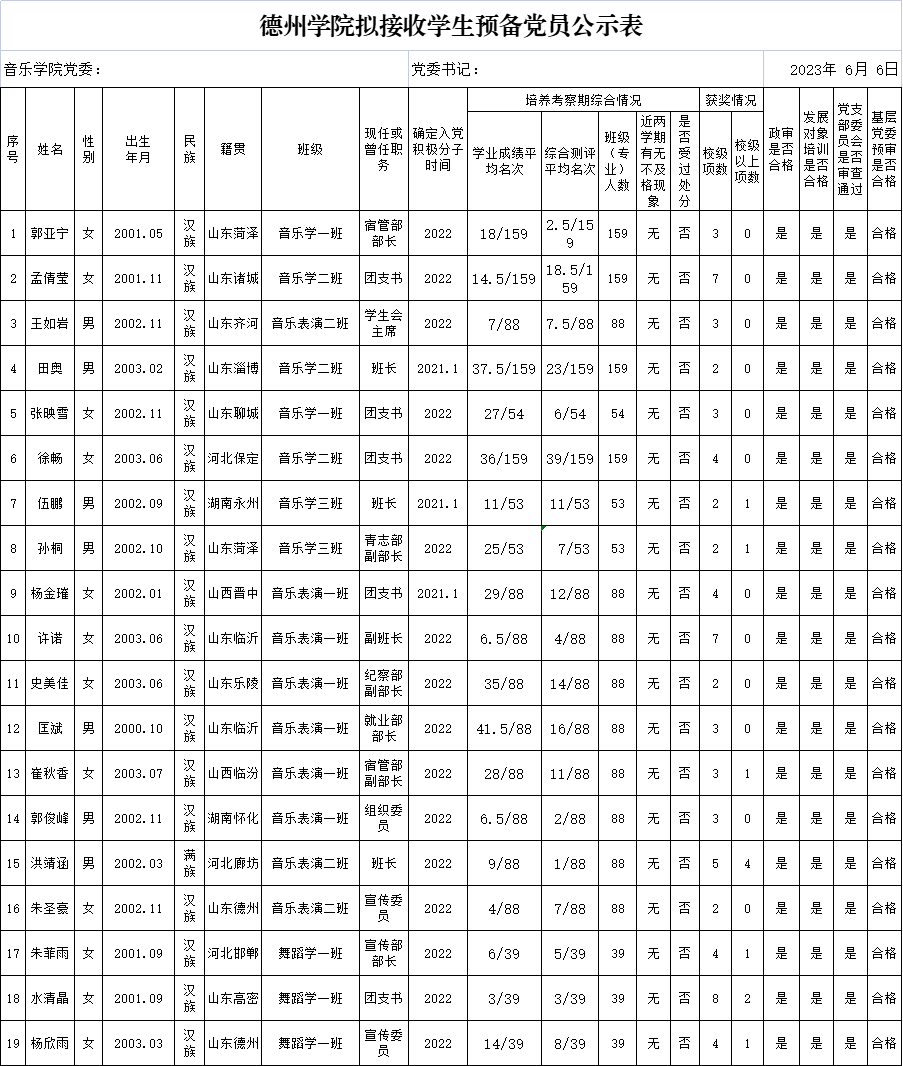 经党组织培养考察,征求党员、群众和培养联系人意见,支委会讨论研究、政治审查、集中培训、基层党委预审,拟接收郭亚宁等19名同志为中共预备党员。为增强发展党员工作的透明度,接受党内外群众的监督,确保发展党员的质量,根据上级文件精神和《中共德州学院委员会发展党员工作实施细则》的要求,现将拟接收预备党员的基本情况公示如下(名单附后):